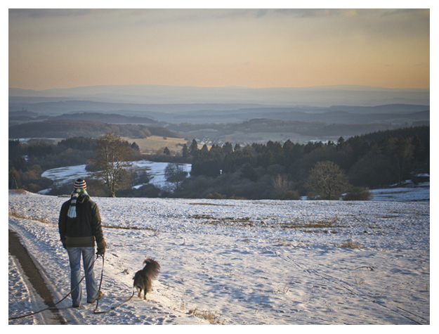 Meine Arbeitstage laufen, abgesehen von den beiden Tagen, die ich im Büro in Frankfurt verbringe, meist ähnlich ab. Gegen fünf weckt mich meine innere Uhr, an Umdrehen und Weiterschlafen ist, ganz im Gegensatz zu den drei Wesen mit denen ich das Bett teile, nicht zu denken – wenn wach, dann wach. Bis ich mich gegen acht mit den Hunden auf den Weg über die Felder mache, habe ich so zumeist schon einen Teil meiner Arbeit erledigt – der Rechner steht schließlich auf wann ich will und stört sich außerdem nicht daran, dass ich nicht in Anzug und Krawatte, sondern in der Jogginghose am Küchentisch sitze. Während die Kollegen gegen zehn nach und nach im Büro ankommen, habe ich bereits die Hunde gefüttert und mich wieder hinter mein Macbook geklemmt, um die Arbeit fortzusetzen – oder um darauf zu warten, was der Tag sonst bringen mag. Die Mittagspause, die an und für sich lieber Nachmittagspause genannt werden möchte, gehört dann endlich wieder ganz den Hunden. Zeit, um an diesem oder jenem Trick zu feilen oder das Haus zum Gegenstand von Suchspielen zu machen findet sich zwar auch zwischendurch, reicht aber nicht aus, um den zweiten Spaziergang, der mal mehr, mal weniger dringend erwartet wird, in Angriff zu nehmen. Zweifelsohne: Schön sind Spaziergänge immer. Dass ein Spaziergang auch lehrreich sein kann, durfte ich heute morgen erfahren.