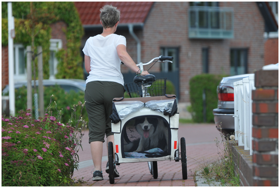 Sonntags gingen wir gleich zur Radvermietung. Ich weiß nicht so genau, wer von meinen Zweibeinern auf die Idee kam, dass ich die Insel im Radanhänger erkunden sollte, schließlich dürfte jedem bekannt sein, dass ich überzeugter Fußgänger bin (das ist etwas anderes, als Bei-Fußgänger, falls jemand fragt). Weil meine Zweibeiner davon scheinbar aber nicht so überzeugt sind und sich auch kaum von meinen Einwänden überzeugen lassen wollten (um seine Menschen zu erziehen braucht man leider viel Geduld), tat ich ihnen schließlich doch den Gefallen und setzte mich rein. Herrchen fuhr gut gelaunt los. Nach mir hat keiner gefragt (falls es jemanden interessiert: meine Laune sank in den Keller). Auf dem Weg zur Ferienwohnung hatte ich dann genug und beschloss, den Anhänger zu verlassen. Das der danach kaputt war, hat mich wenig gestört – ich war ja draußen. Frauchen hat es aber leider geschafft, sich Nadel und Zwirn zu besorgen und den Hänger zu flicken. Also: Ich wieder rein und die ganze Nachbarschaft zusammen geheult. Wir waren die Attraktion! Weil mich aber trotzdem niemand befreit hat, kam mir schließlich die Idee, mal die Krallen auszuprobieren. Merke: Wo die Krallen durch passen, passt auch die Pfote durch. Und wo die Pfote durch passt, mit etwas Mühe auch die ganze Schnauze … was hat Frauchen sich gefreut!