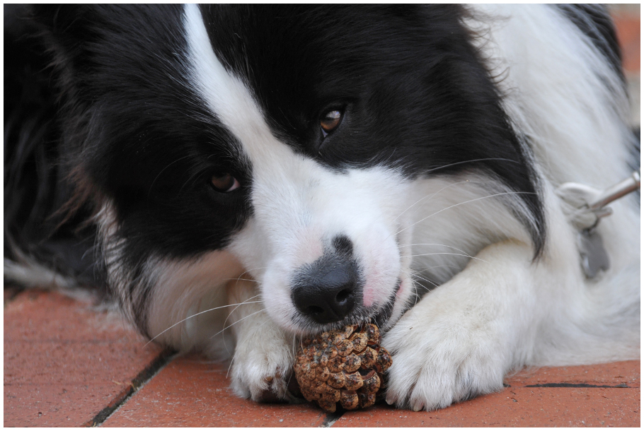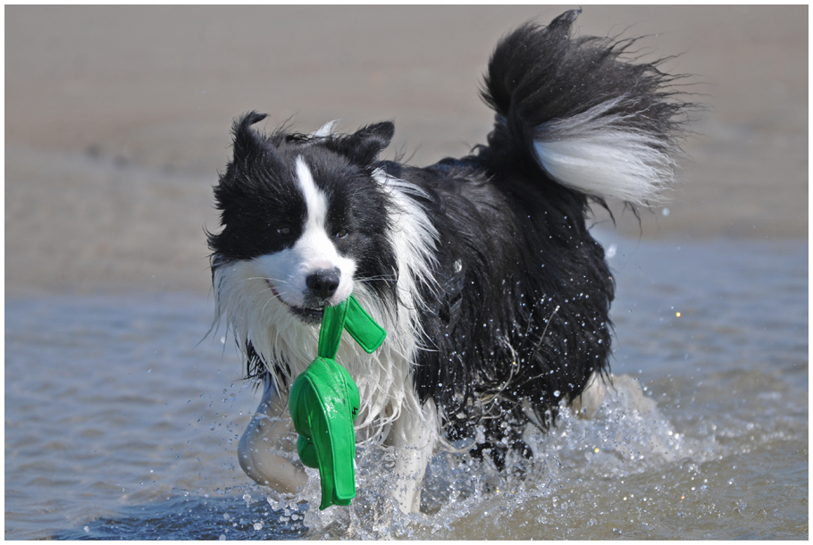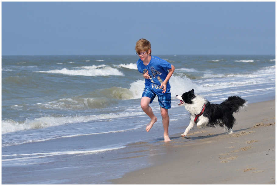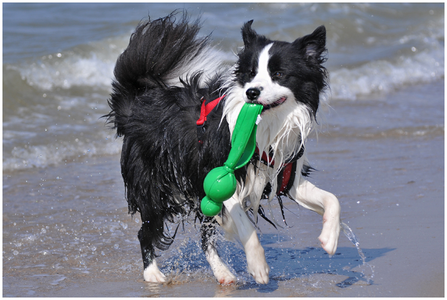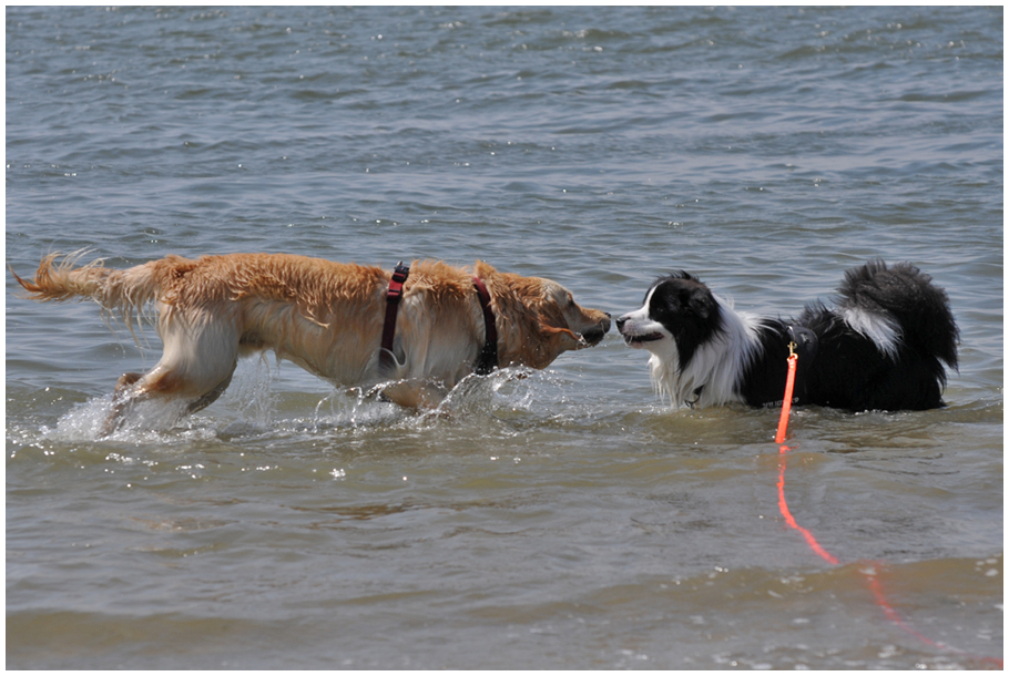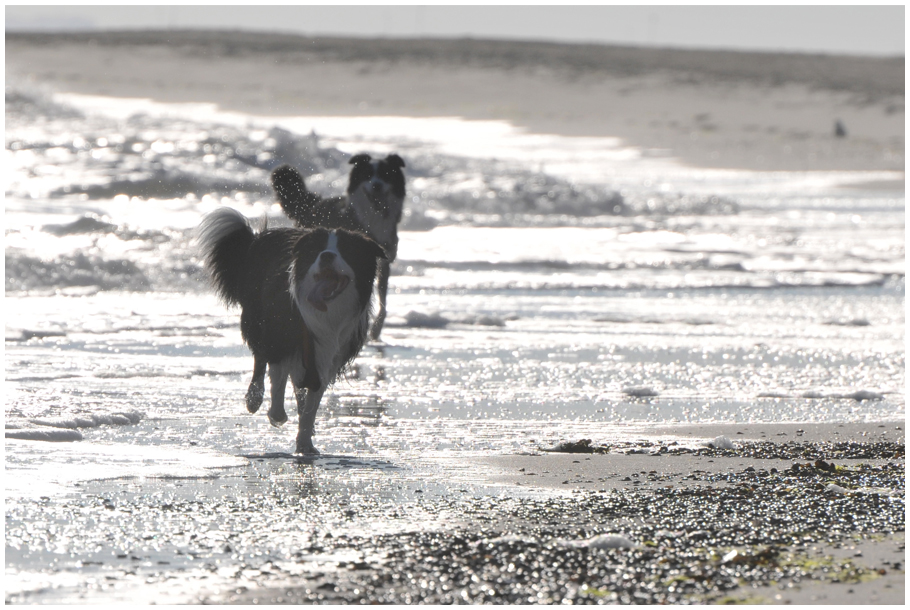 Gleich am nächsten Tag ging es wieder zur Fähre (ohne Rad!). Mein Freund Mylo und seine Frauchen kamen zu Besuch. Das war toll! Ich habe aber auch Freundinnen auf der Insel gefunden – mit Emma und Diva, den beiden Border Collie Hündinnen, bin ich oft am Strand spazieren gegangen. Am letzten Tag waren wir alle am Deich unterwegs – ohne Leine, wohlgemerkt (obwohl man das eigentlich nicht darf) –, als Emma einen Hasen entdeckt hat. Unsere Frauchen waren mit Quatschen abgelenkt, also setzte Emma an und ich (man überlässt einer Dame schließlich nicht die ganze Arbeit allein) hinterher. Die Frauchen tatütataten: »Emma, hier« und »Joey, hier«. Wir also wieder rauf auf den Deich (obwohl man auch das eigentlich nicht darf), Emma mit dem Hasen quer im Maul. Die Frauchen entsetzt: »Emma, aus« und »Joey, hier«. Haben wir gemacht. Wir sind ja brave Hunde. Der Hase ist dann übrigens über den Deich davon gelaufen (obwohl man das eigentlich … nee, stimmt schon, der darf das!).