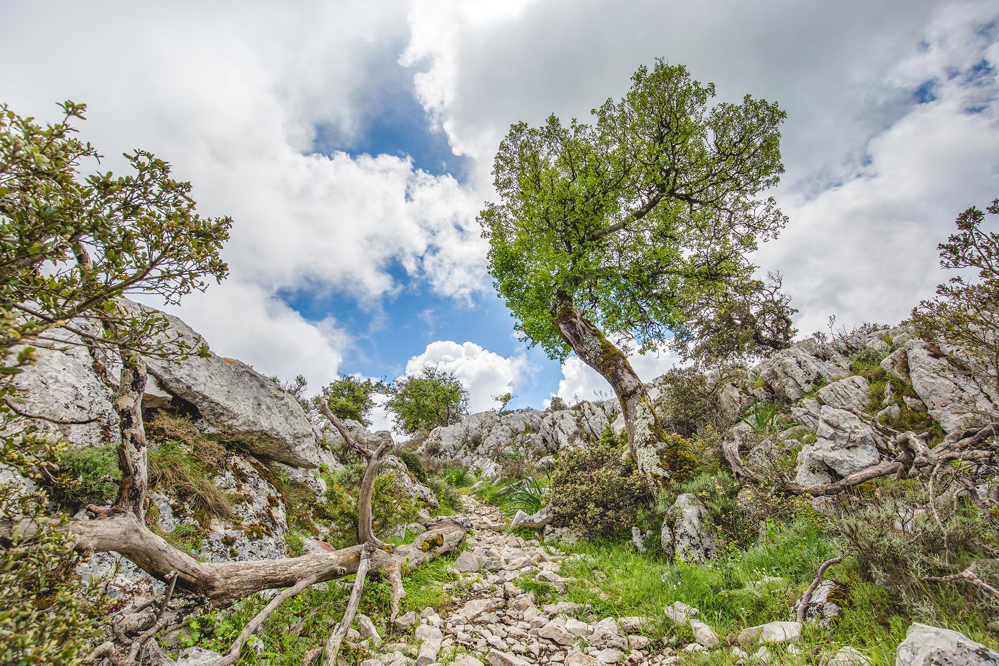 Weil unser zweiter Urlaubstag auf einen Sonntag fällt und wir uns mit den vier Hunden nur ungern zu den Scharen sonnenhungriger Italiener gesellen möchten, die an den Sonntagen die – in der Vorsaison ansonst noch menschenleeren – Strände bevölkern, beschließen wir dem Meer den Rücken zu kehren und stattdessen die Wanderstiefel zu schnüren. Schnell ist im Wanderführer eine geeignete Strecke gefunden, die – mit viereinhalb Stunden Gehzeit und fast sechshundert zu bewältigenden Höhenmetern – zwar als anspruchsvoll gekennzeichnet ist, mit den Hunden aber noch gut machbar scheint. Der Monte Albo im Nordosten Sardiniens ist mit seinen 1.127 Metern zwar längst nicht so hoch wie der Höhenzug des Gennargentu (1.834 Meter), verspricht von der Punta Catirina – einem von zwei Gipfeln – aber einen beeindruckenden Rundblick und auf dem Weg alte Eichenwälder, die uns und den Hunden kühlen Schatten spenden.