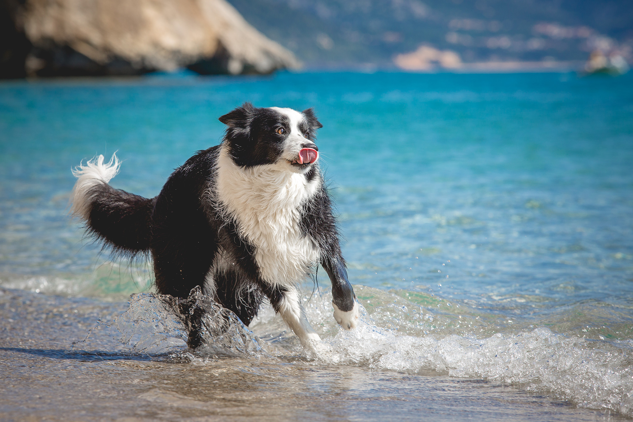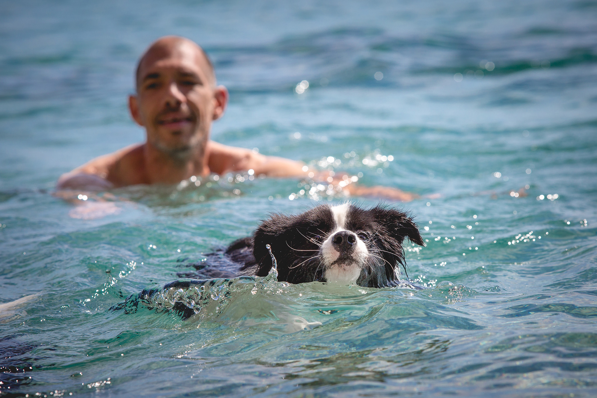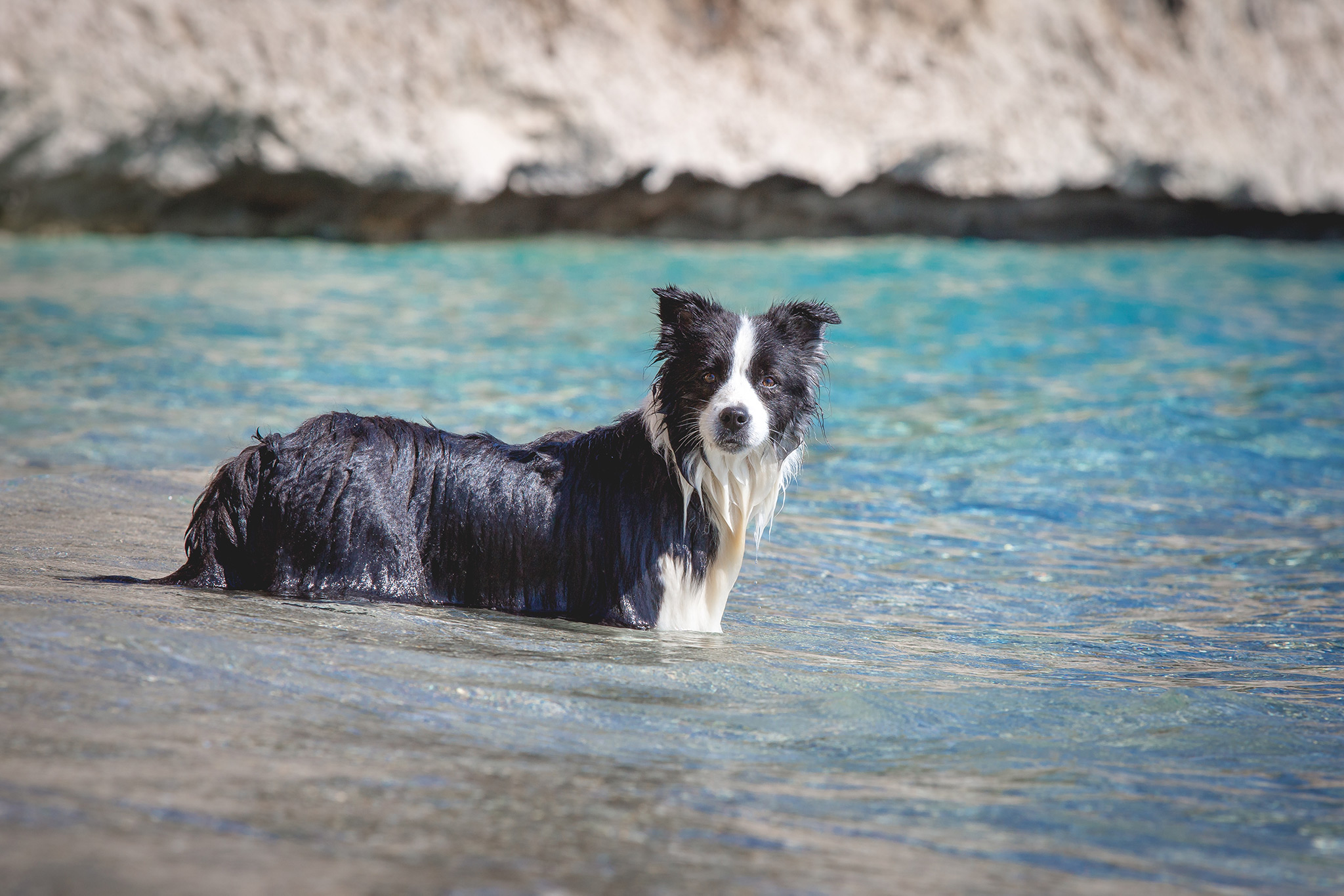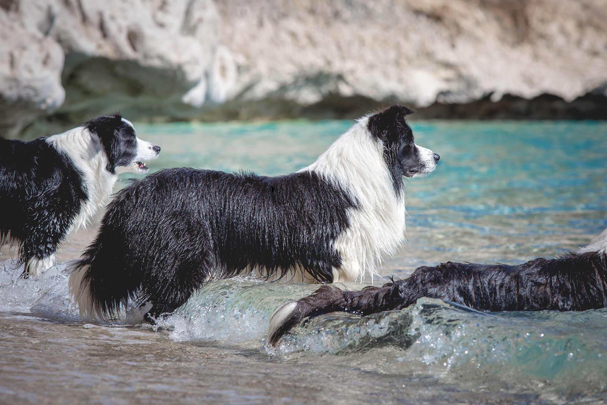 Den Tag darauf verbringen wir am Strand, der genauso leer ist, wie wir erwartet haben: nur zwei weiteren Badegästen begegnen wir am Hundestrand, der sich von unserem Ferienhaus fußläufig hinter der Hafenmole von Osalla befindet, am weitläufigen Sandstrand links davon – an dem offiziell keine Hunde erlaubt sind – bleiben wir ganz allein. Nell, Ida und Zion – die Augen vor Freude weit aufgerissenen – stürzen sich gleich in die Fluten, während Heidi am Ufer zurückbleibt und das Spiel der Wellen, die sich laut an den grauen Felsen brechen, kritisch beäugt. Weil meine neue Badehose ohnehin eingeweiht werden will, nehme ich unsere Jüngste kurzerhand auf den Arm und mit ins kühle Nass – und gebe der unsicher paddelnden Hündin den ersten, wenn auch nicht ganz freiwilligen Schwimmunterricht.