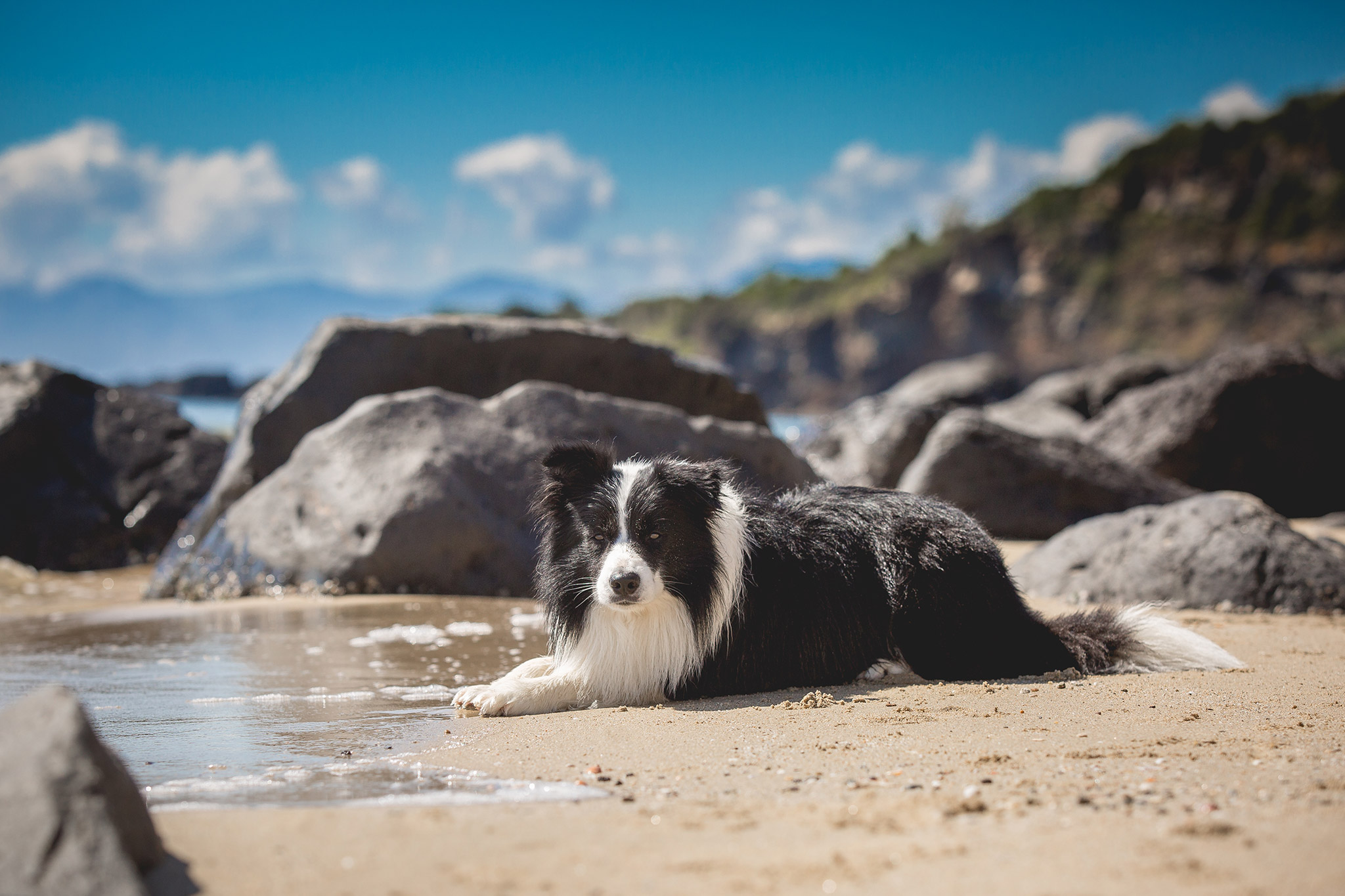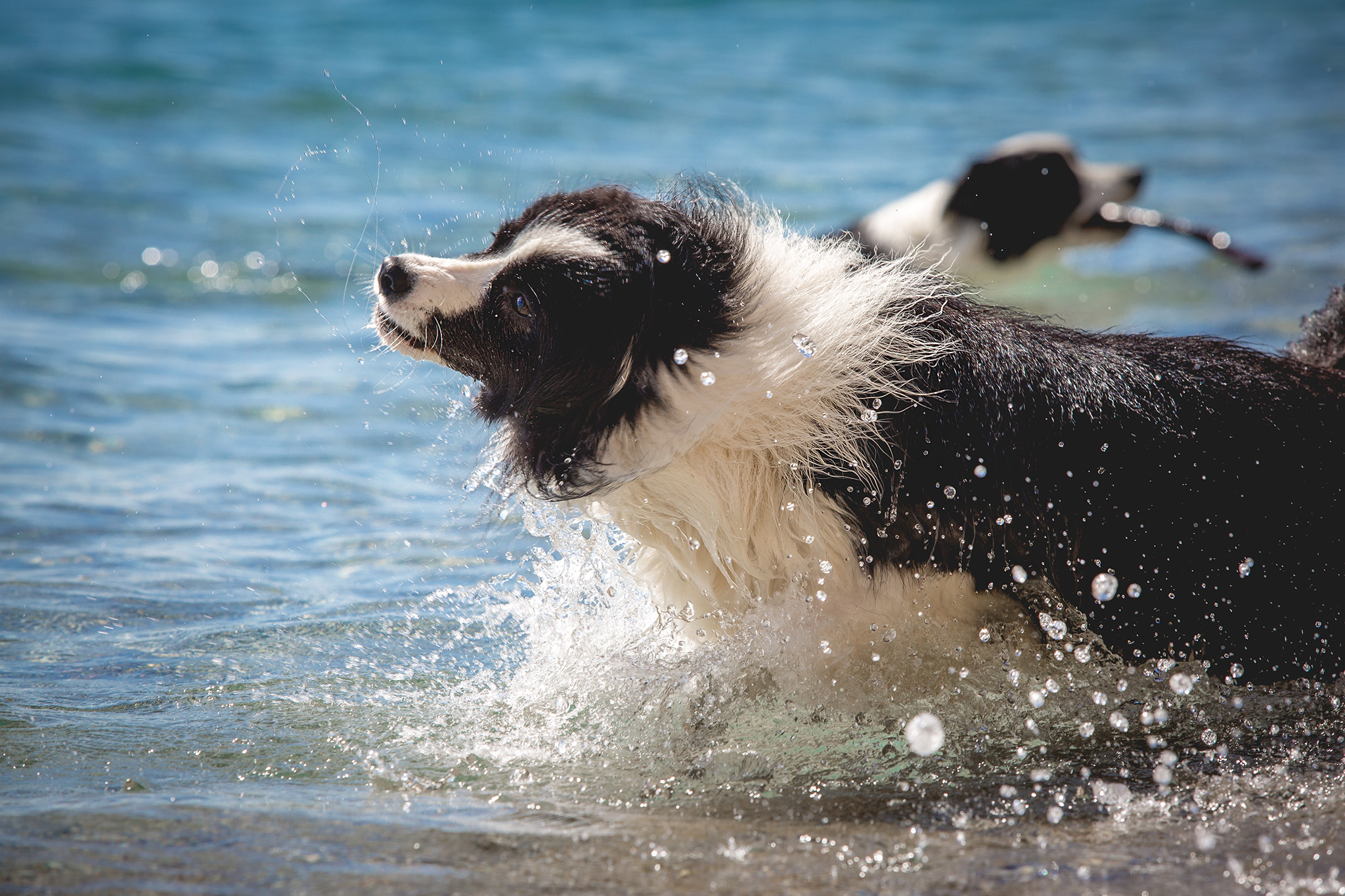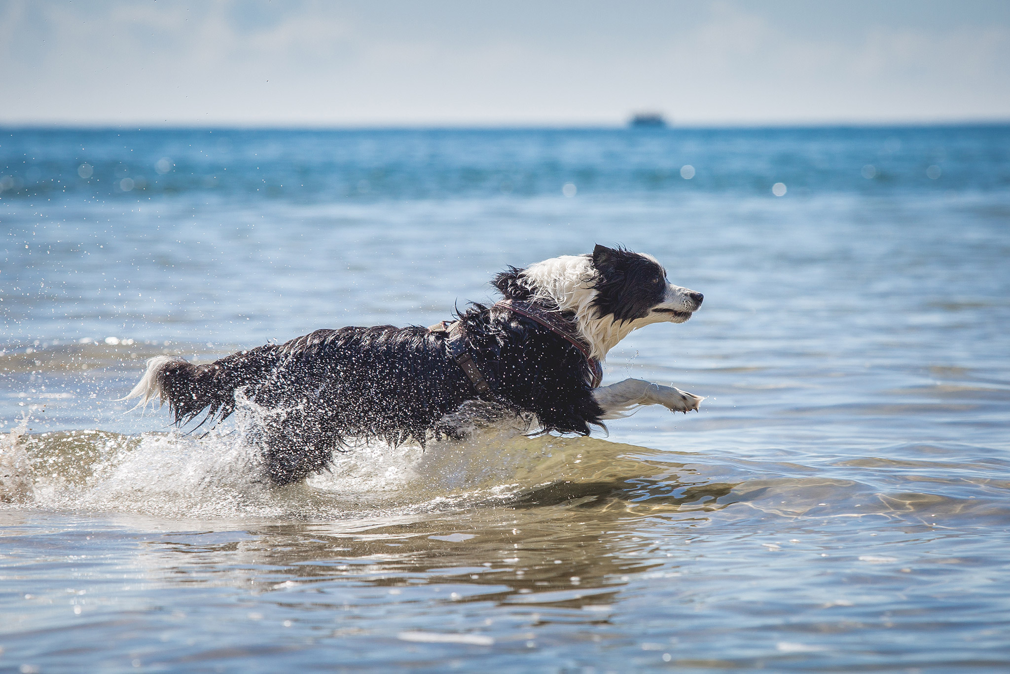 Den Tag darauf verbringen wir am Strand, der genauso leer ist, wie wir erwartet haben: nur zwei weiteren Badegästen begegnen wir am Hundestrand, der sich von unserem Ferienhaus fußläufig hinter der Hafenmole von Osalla befindet, am weitläufigen Sandstrand links davon – an dem offiziell keine Hunde erlaubt sind – bleiben wir ganz allein. Nell, Ida und Zion – die Augen vor Freude weit aufgerissenen – stürzen sich gleich in die Fluten, während Heidi am Ufer zurückbleibt und das Spiel der Wellen, die sich laut an den grauen Felsen brechen, kritisch beäugt. Weil meine neue Badehose ohnehin eingeweiht werden will, nehme ich unsere Jüngste kurzerhand auf den Arm und mit ins kühle Nass – und gebe der unsicher paddelnden Hündin den ersten, wenn auch nicht ganz freiwilligen Schwimmunterricht.