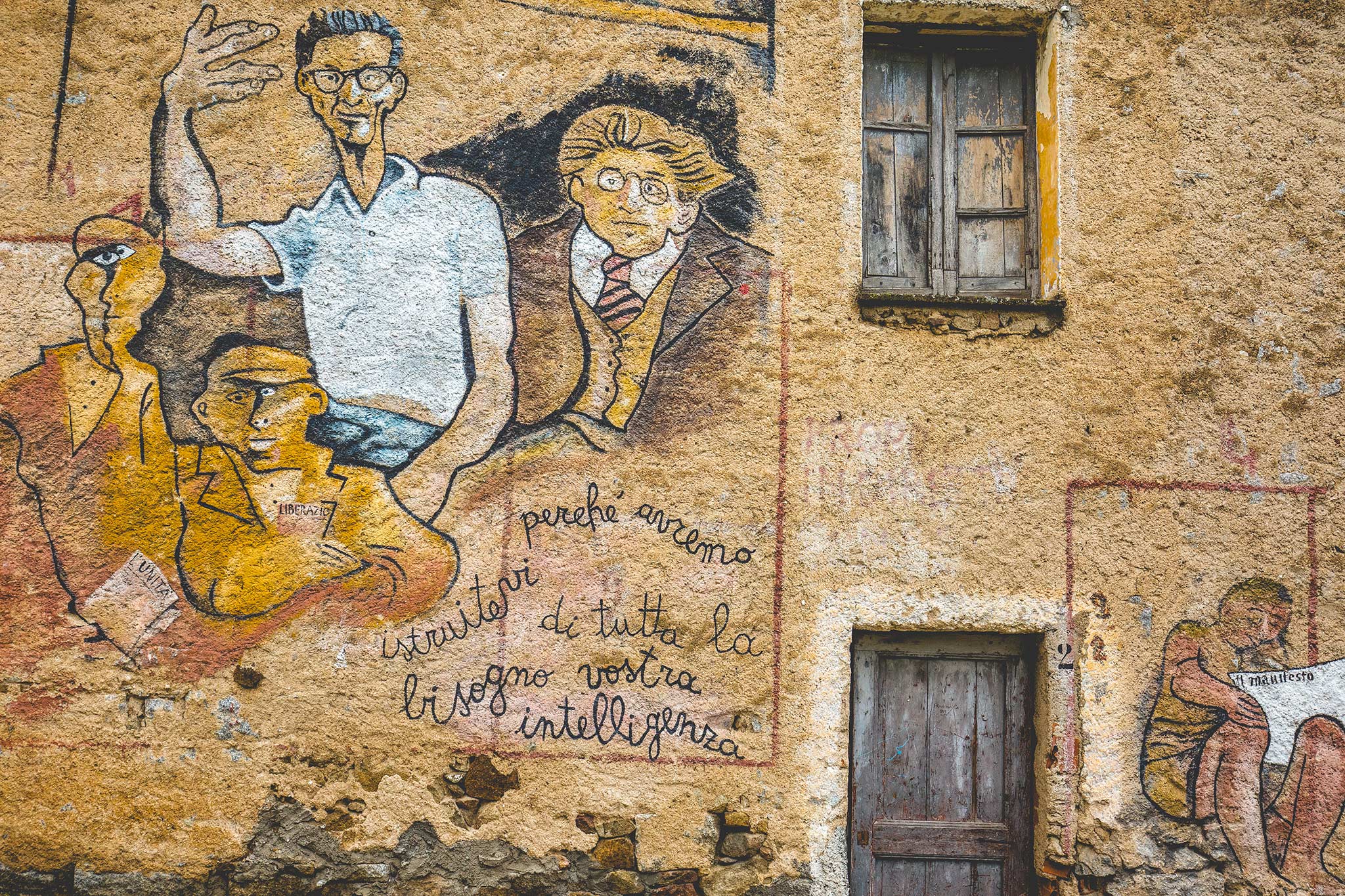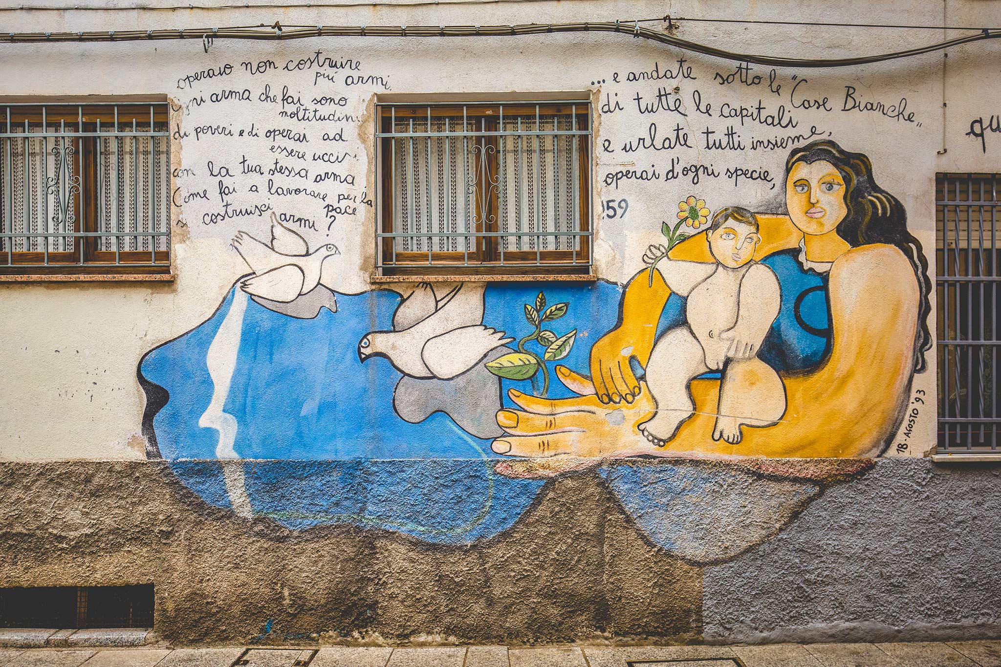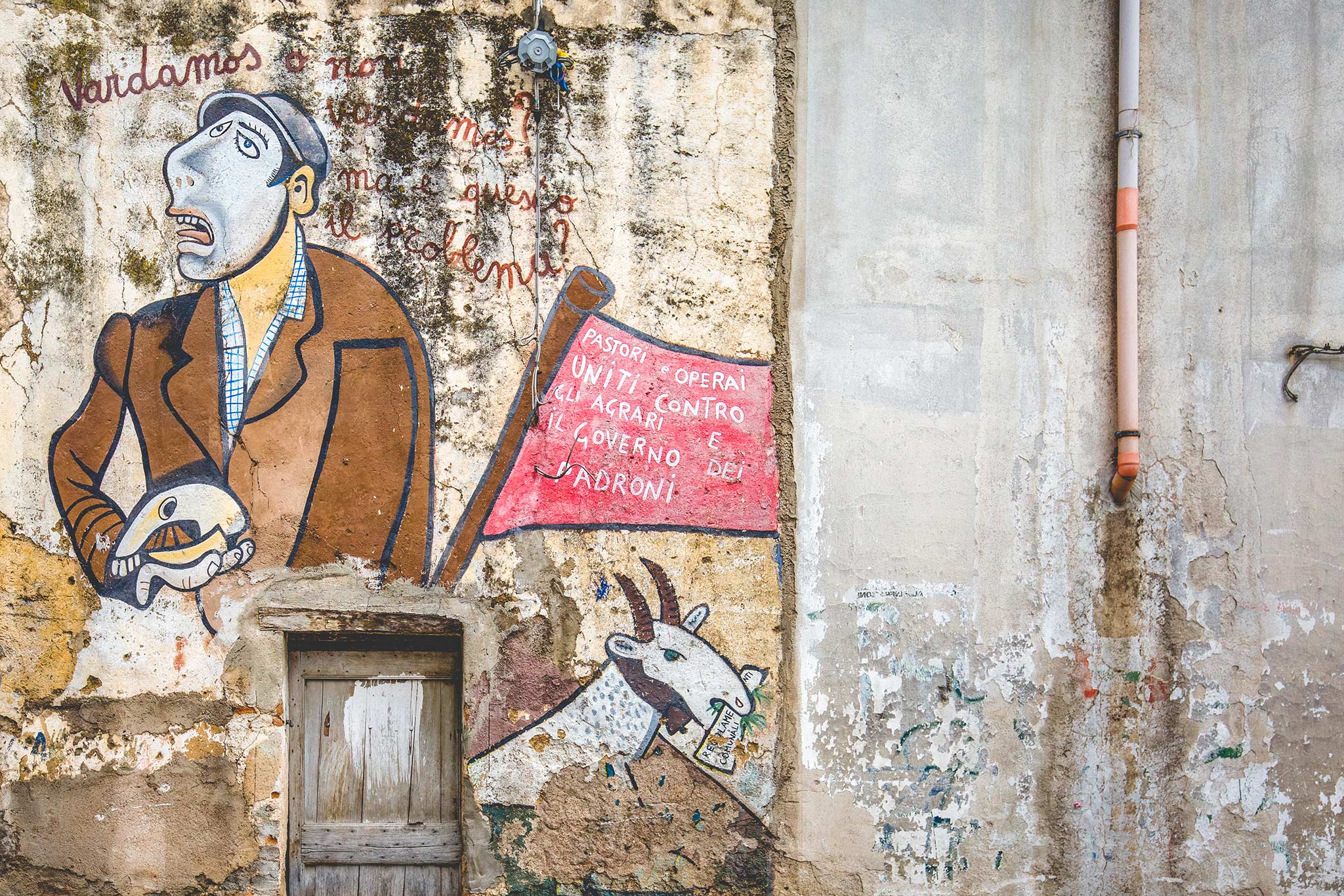 Orgosolo (die Betonung liegt, wie mich Fausto – die bärtige Maria – mit einem Lächeln berichtigt, auf der zweiten Silbe) heißt unser Ziel am ersten Tag, und ist vor allem für seine Murales – großflächige Wandgemälde, die mehr als hundert Fassaden in dem kleinen Bergdorf zieren – bekannt. Den Ursprung in den späten sechziger Jahren und die Nähe zur Kommunistischen Partei merkt man vielen der Gemälde an, an denen wir vorbeispazieren – zwischen Marx und Engels, die von vielen Häuserwänden grüßen, findet auch ein Che Guevara seinen Platz, wird die Staats- und Weltpolitik hinterfragt oder an die Partisanenkämpfe im Faschismus erinnert. Stilistisch zitiert vieles Picassos Guernica – um das zu erkennen braucht es nicht einmal einen Blick in den Reiseführer, sondern bloß ein bisschen kulturelles Interesse. Eine, vielleicht anderthalb Stunden laufen wir im Regen durch die schmalen Gassen, hinter jeder Ecke wartet ein neuer Kommentar zum Zeitgeschehen – und als wir den Ort verlassen, spielen Jim Morrison und die Doors im Autoradio dazu. Was, frage ich mich, könnte besser passen?