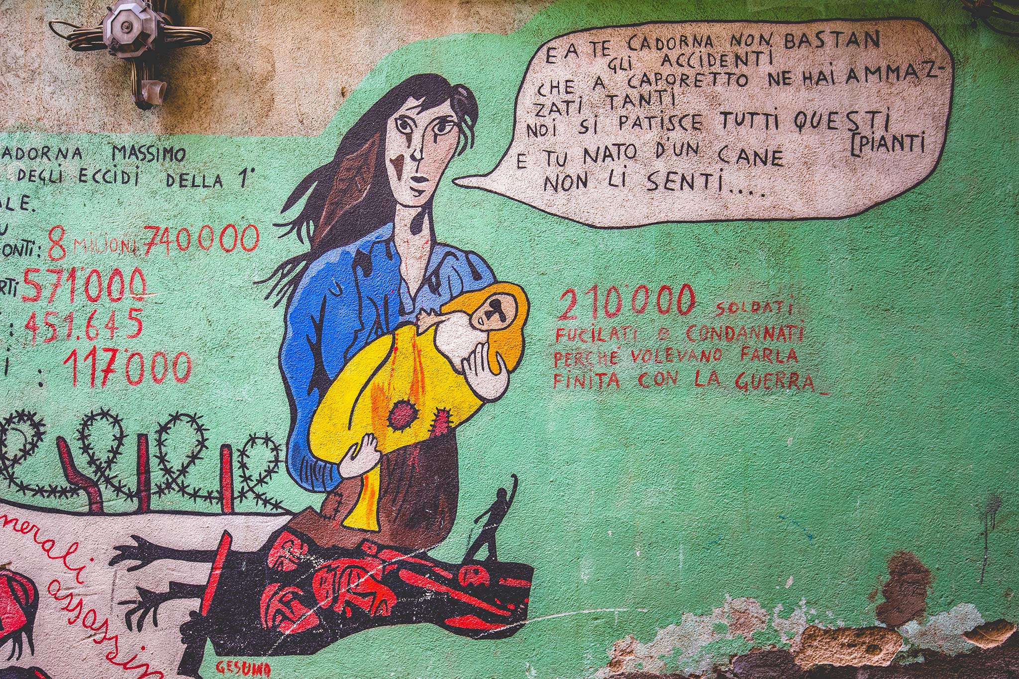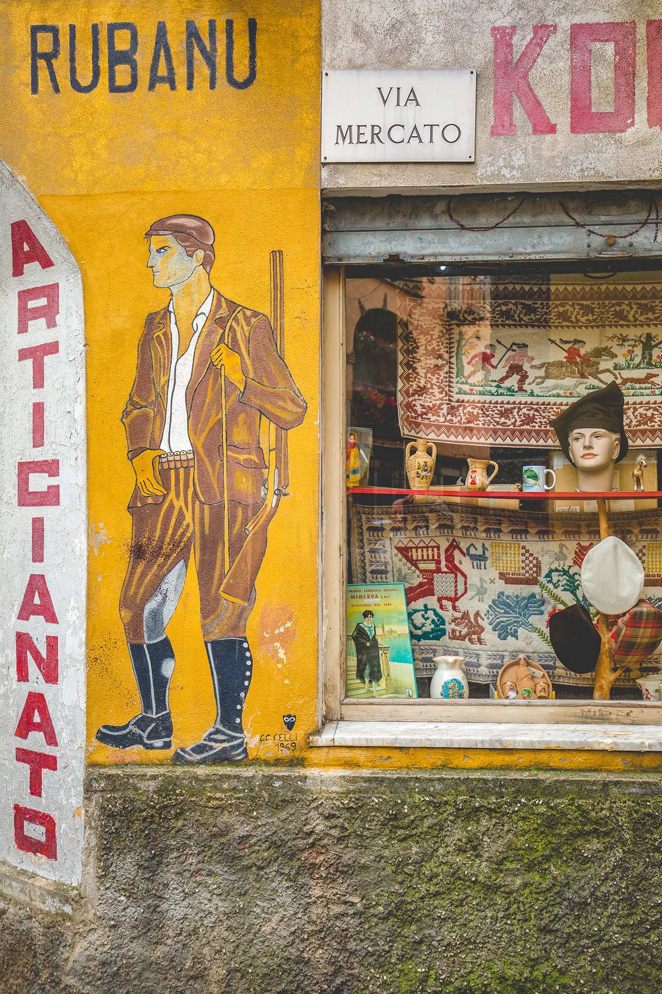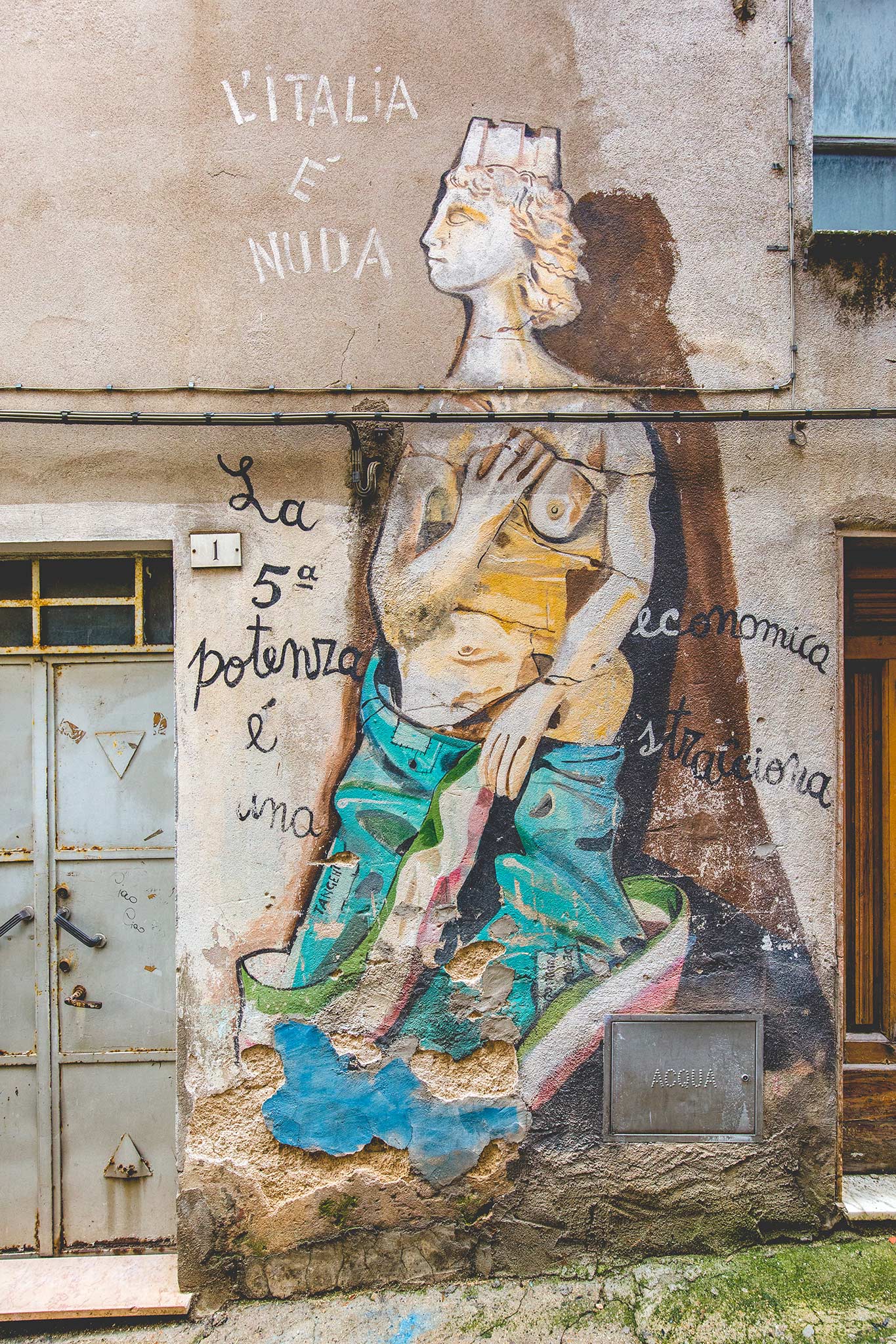 Orgosolo (die Betonung liegt, wie mich Fausto – die bärtige Maria – mit einem Lächeln berichtigt, auf der zweiten Silbe) heißt unser Ziel am ersten Tag, und ist vor allem für seine Murales – großflächige Wandgemälde, die mehr als hundert Fassaden in dem kleinen Bergdorf zieren – bekannt. Den Ursprung in den späten sechziger Jahren und die Nähe zur Kommunistischen Partei merkt man vielen der Gemälde an, an denen wir vorbeispazieren – zwischen Marx und Engels, die von vielen Häuserwänden grüßen, findet auch ein Che Guevara seinen Platz, wird die Staats- und Weltpolitik hinterfragt oder an die Partisanenkämpfe im Faschismus erinnert. Stilistisch zitiert vieles Picassos Guernica – um das zu erkennen braucht es nicht einmal einen Blick in den Reiseführer, sondern bloß ein bisschen kulturelles Interesse. Eine, vielleicht anderthalb Stunden laufen wir im Regen durch die schmalen Gassen, hinter jeder Ecke wartet ein neuer Kommentar zum Zeitgeschehen – und als wir den Ort verlassen, spielen Jim Morrison und die Doors im Autoradio dazu. Was, frage ich mich, könnte besser passen?