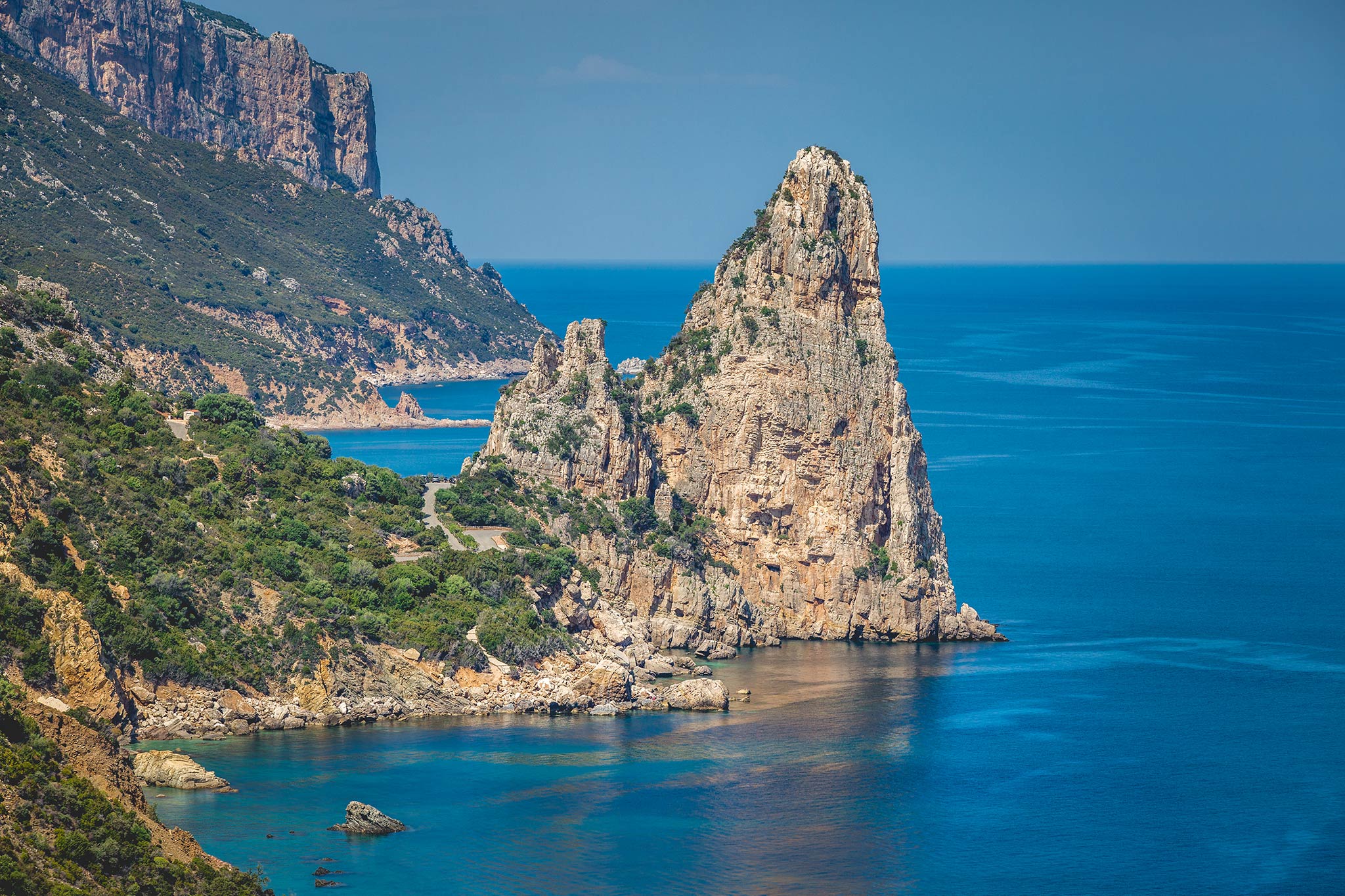 Weiter führt uns der Weg von Lanusei über Arbatax nach Santa Maria Navarese – eigentlich bloß, um noch einen schnellen Blick auf das Meer zu werfen und den Hunden vielleicht ein wenig Abkühlung zu gönnen –, weil aber die Wolken entlang der Küste in der Zwischenzeit aufgerissen sind und die Wanderung zur Pedra Longa – einer Felsnadel, die über hundert Meter aus dem Meer herausragt – mit ihren drei Stunden Gehzeit auch am frühen Nachmittag noch machbar scheint, stellen wir das Auto am Ortsrand ab und genießen die atemberaubende Aussicht auf das in allen Blautönen schimmernde Meer, die sich vom gut befestigten Wanderweg bietet.