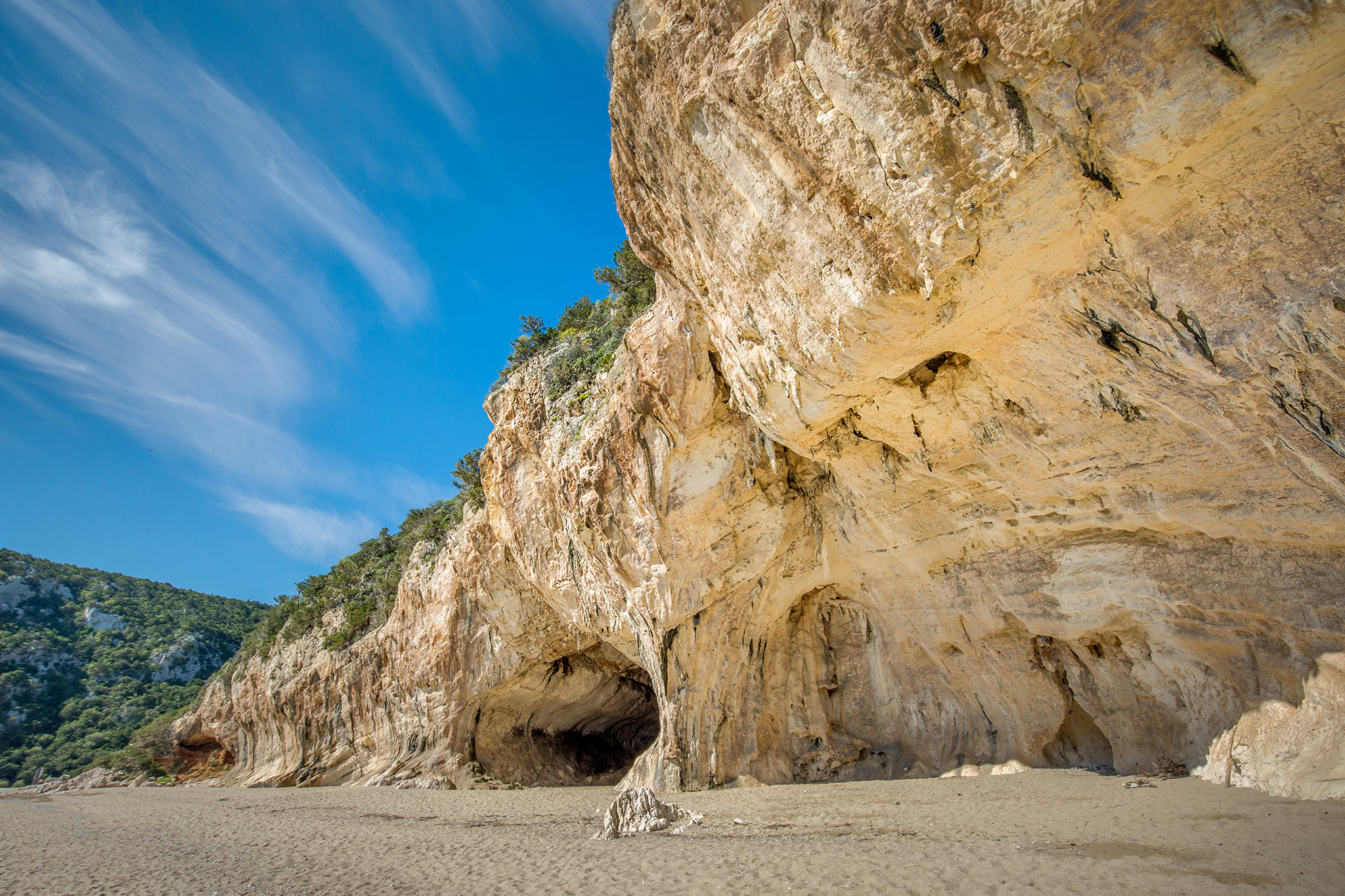 Die rund zweistündige Wanderung zur Cala Luna beginnt mit einem felsigen Anstieg, der sich steil aus der Schlucht heraus windet, danach geht es über zumeist gut ausgetretene Pfade von einem Hügel zum nächsten – die Küste dahinter lässt sich nur erahnen, zu dicht ist die Macchia, zu hoch die Erdbeerbäume, die Strandkiefern und der Wacholder. Nach einer guten Stunde haben wir die Codula Oddoana erreicht, das Gelände fällt über Steinstufen steil in die Schlucht ab – wir lassen die vier Hunde sich ihren eigenen Weg nach unten suchen, während wir uns mit beiden Händen beim Abstieg behelfen müssen. Nach einem weiteren Anstieg öffnet sich der Blick auf die Felswand, von der die Cala Luna eingefasst wird, davor lässt sich ein kurzer Steg erkennen, an dem gerade ein Ausflugsboot angelegt hat – winzig zeichnen sich Menschen vor dem grauen, noch im Schatten liegenden Gestein ab. Ich bin ein wenig ernüchtert – aber was will man von einem Paradies erwarten, das längst kein Geheimtipp mehr ist?