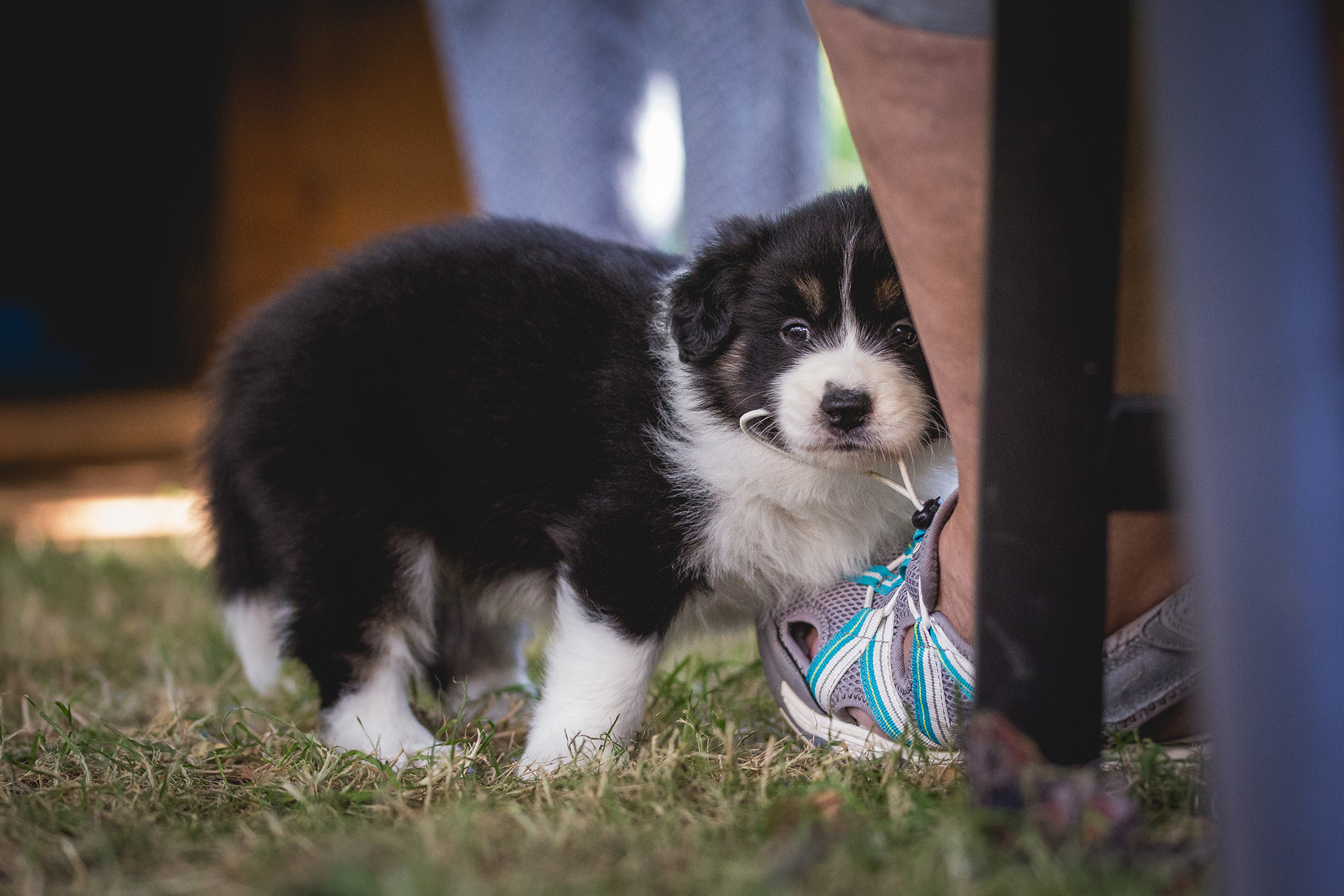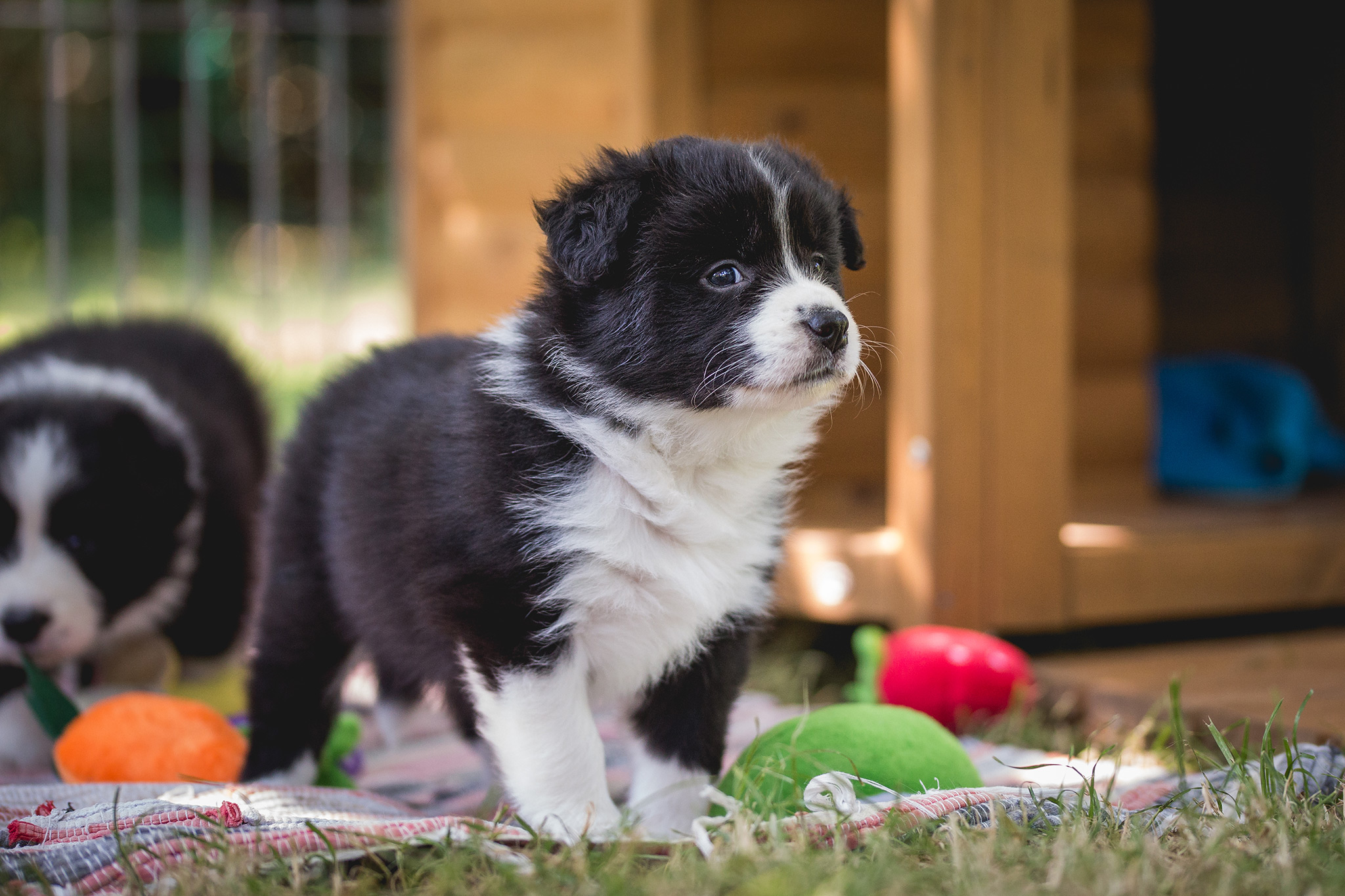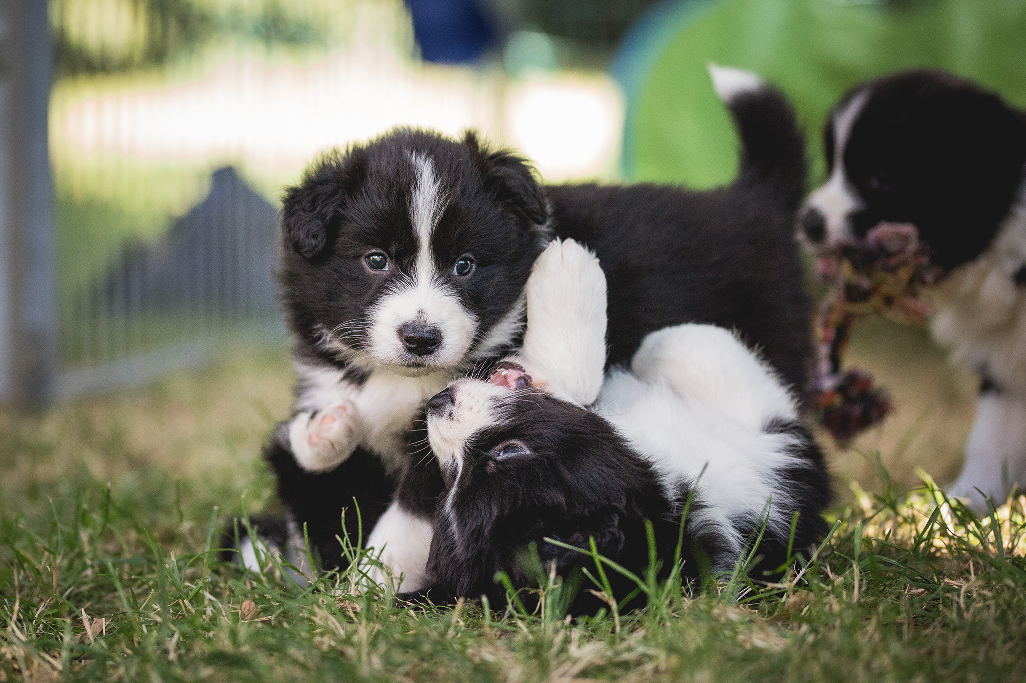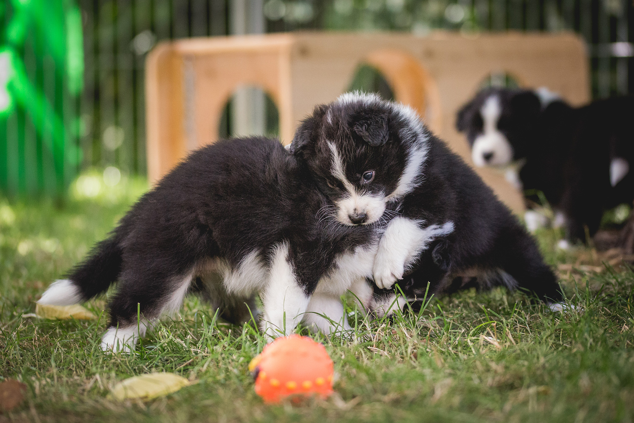 »Ich brauche wirklich eine größere Klappbox«, denke ich, als ich am frühen Morgen mit einer schaukelnden grünen Kiste voller Welpen durch den Garten laufe, »die hier hat eindeutig ausgedient«. Tatsächlich ist die besagte Klappbox längst zu eng für die fünf Welpen, die dicht gedrängt darin hocken und nur darauf warten, endlich im Auslauf anzukommen und daraus entlassen zu werden. »Eine größere Klappbox oder deutlich größere Hände.« Da unser Welpenzimmer keinen direkten Zugang zum Garten besitzt, die Welpen nach dem Aufstehen aber umgehend nach draußen befördert werden wollen, um ihre Morgentoilette erledigen zu können, war die grüne Kiste in den vergangenen Tagen eine gute, zeitsparende Lösung: wo fünf Welpen müssen – und Welpen müssen morgens nicht nur immer, sondern auch besonders dringend –, kann man es sich nicht leisten, Zeit zu verlieren. »Schnell sein oder schrubben«, sage ich zu mir selbst, als ich schließlich einen Welpen nach dem anderen im Auslauf ins Gras setze – und mit einem zufriedenen Grinsen feststelle, dass auch der Letzte glücklich seufzend ein langes Bächlein laufen lässt.