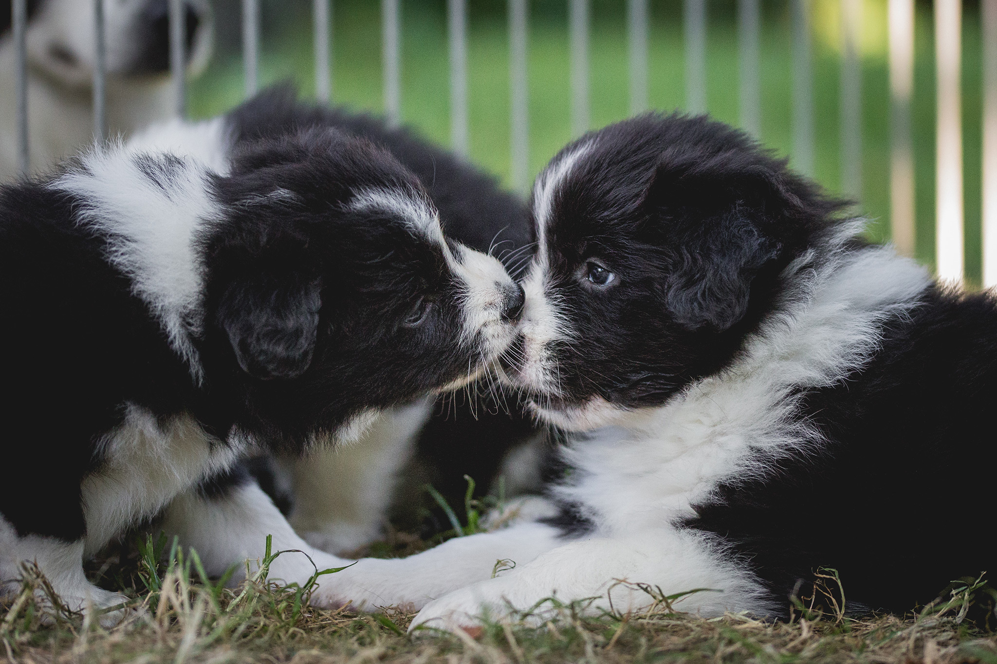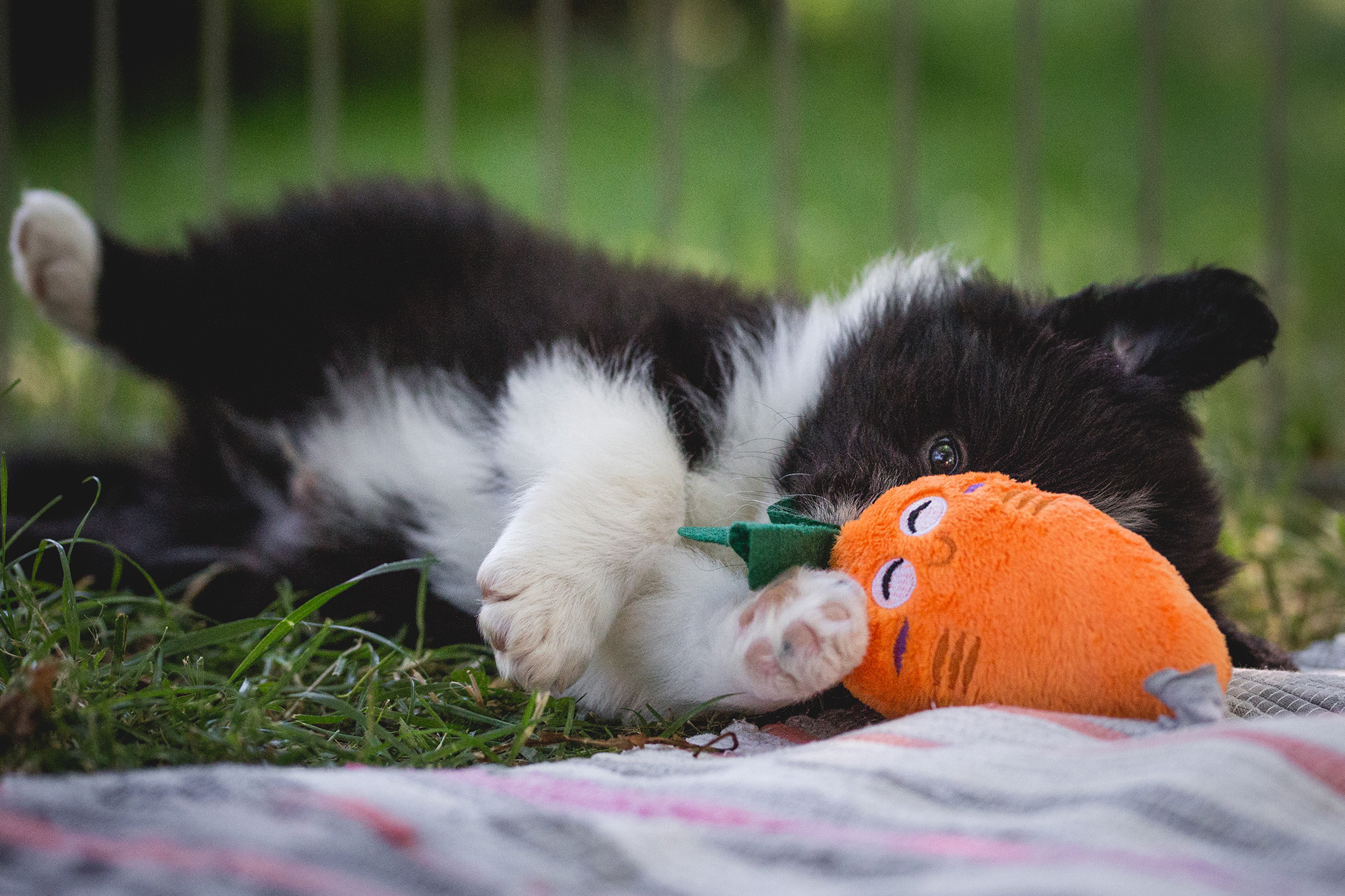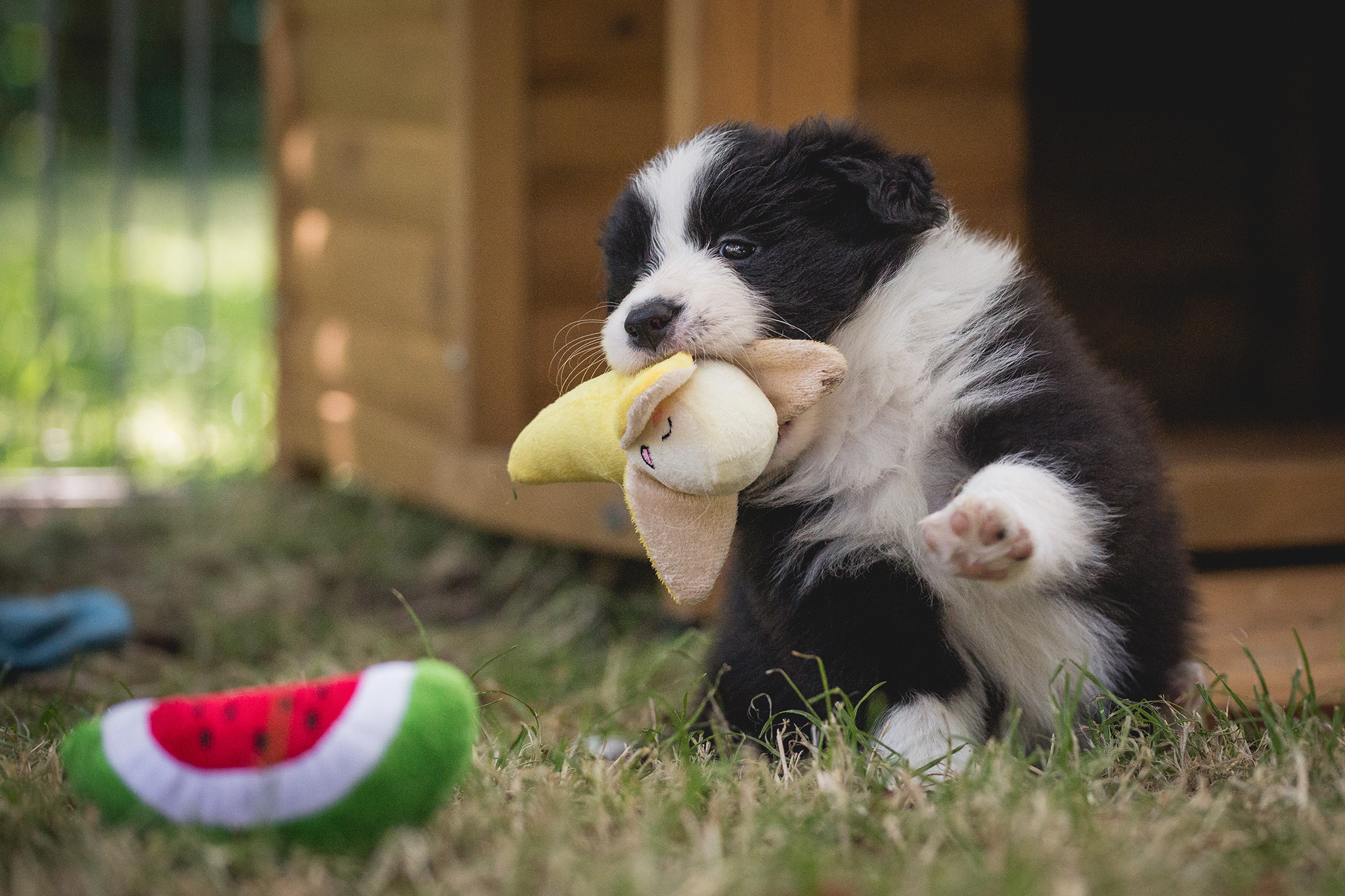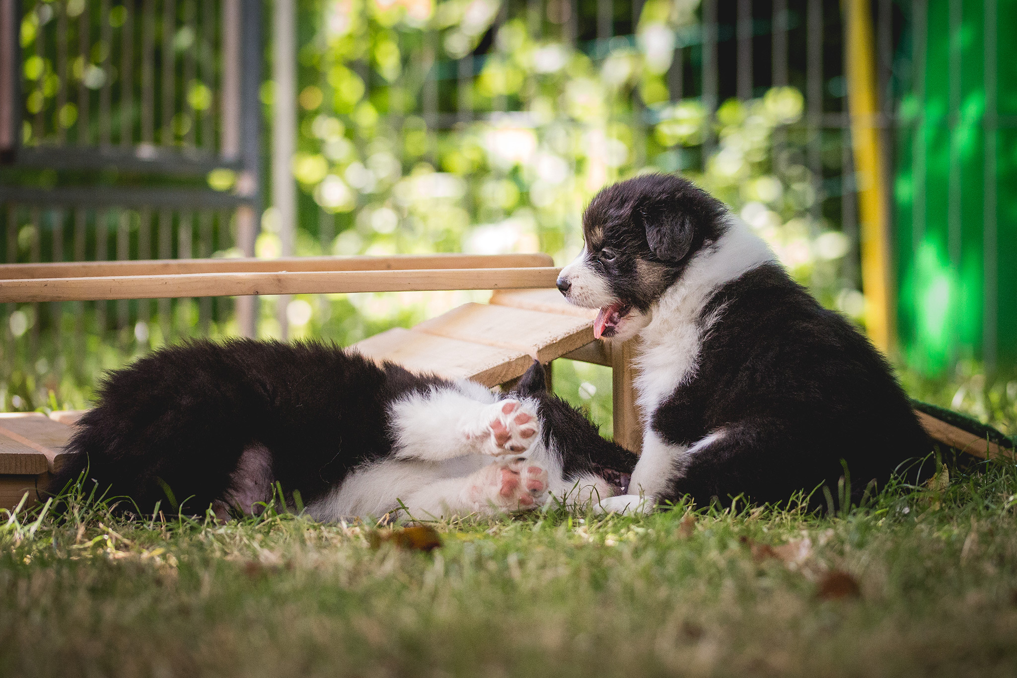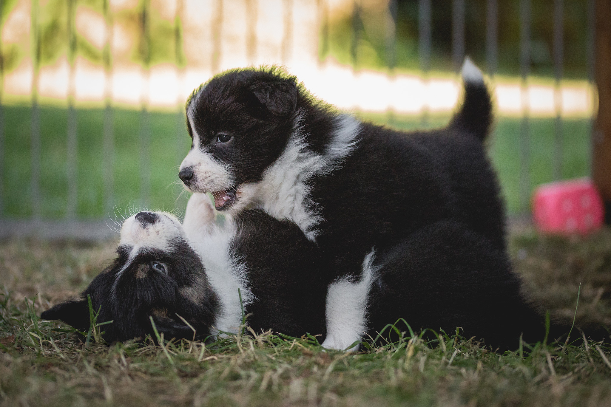 Dass der Boden drinnen regelmäßig gewischt und mit Desinfektionsmittel behandelt wird, ist naheliegend – aber auch draußen behalten wir die Toilettengänge der Welpen immer im Blick und sammeln ihre Hinterlassenschaften umgehend ein. Das nicht bloß, um zu verhindern, dass die Welpen auf den Geschmack kommen, Kot fressen oder sich darin wälzen, sondern auch, weil die Ausscheidungen der Welpen bei den heißen Temperaturen schnell ungebetene Gäste anlocken, sich Fliegen und Wespen im Auslauf tummeln. Auch hier steht also immer eine große Papierrolle bereit – und eine gut gefüllte Gießkanne, um auch das letzte Bisschen guten Geruchs aus dem Gras zu tilgen.
