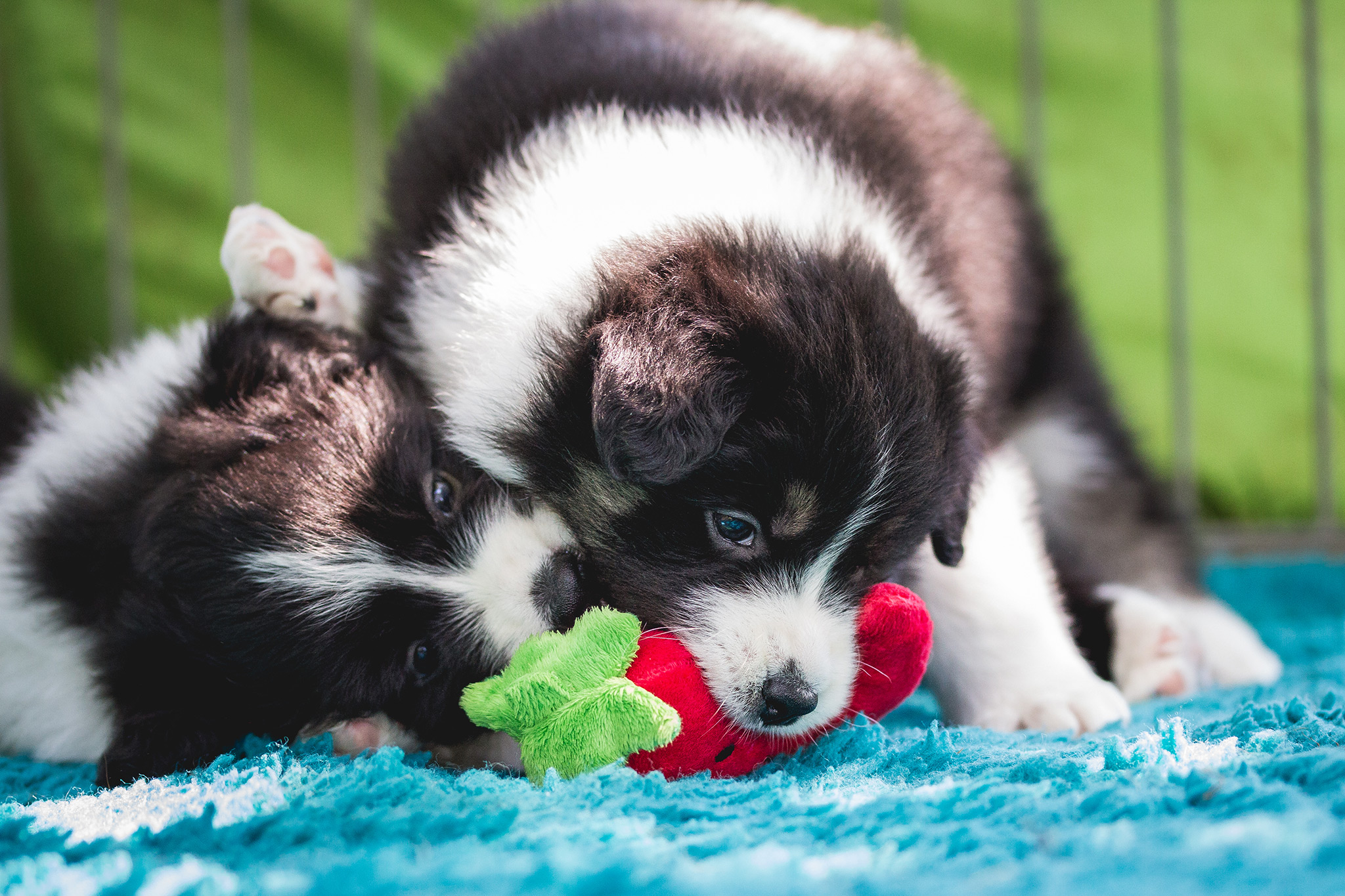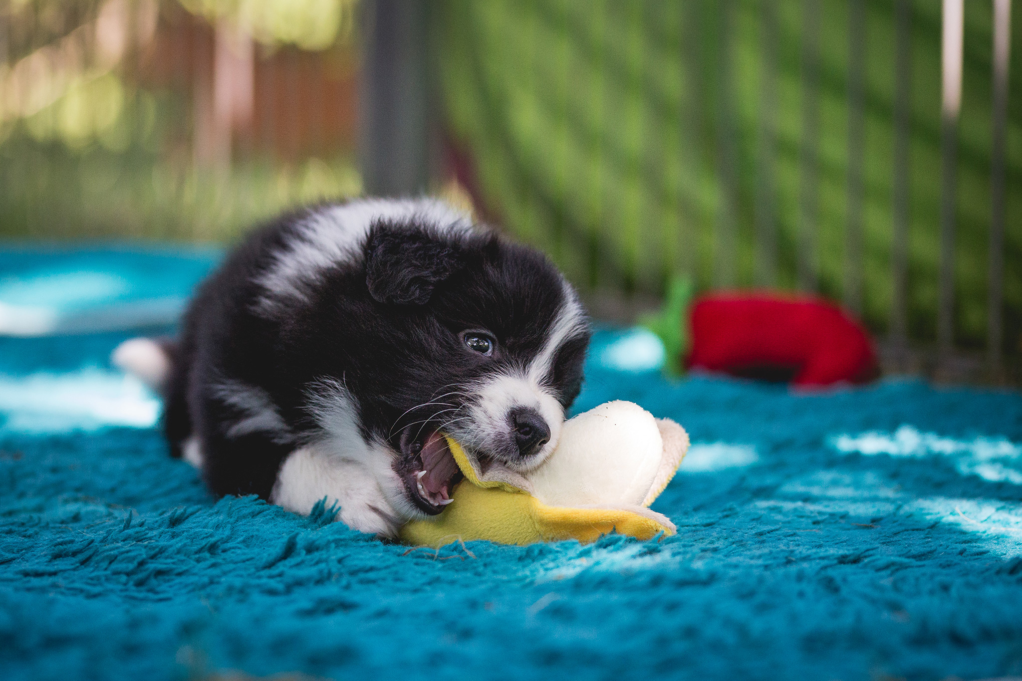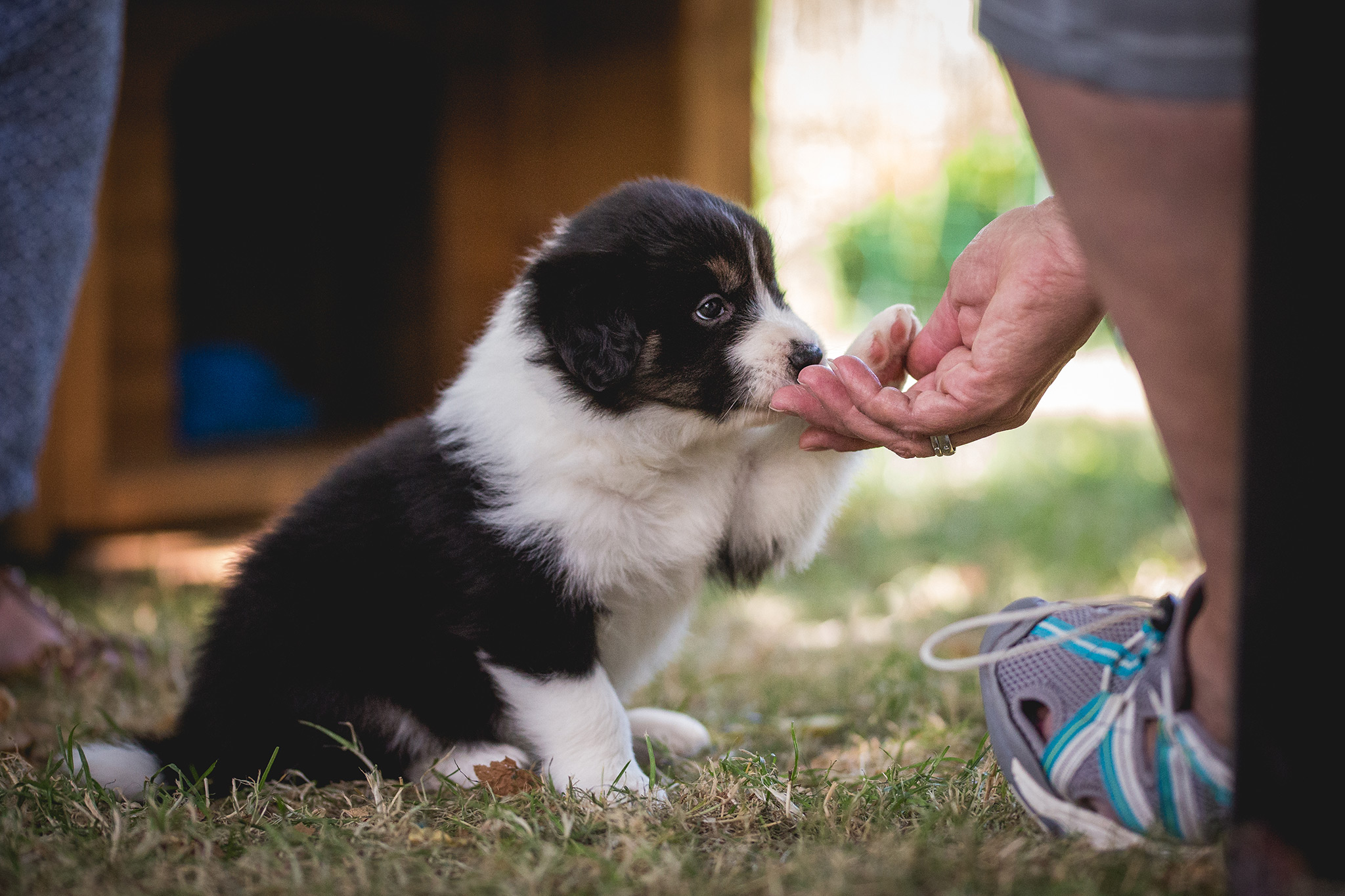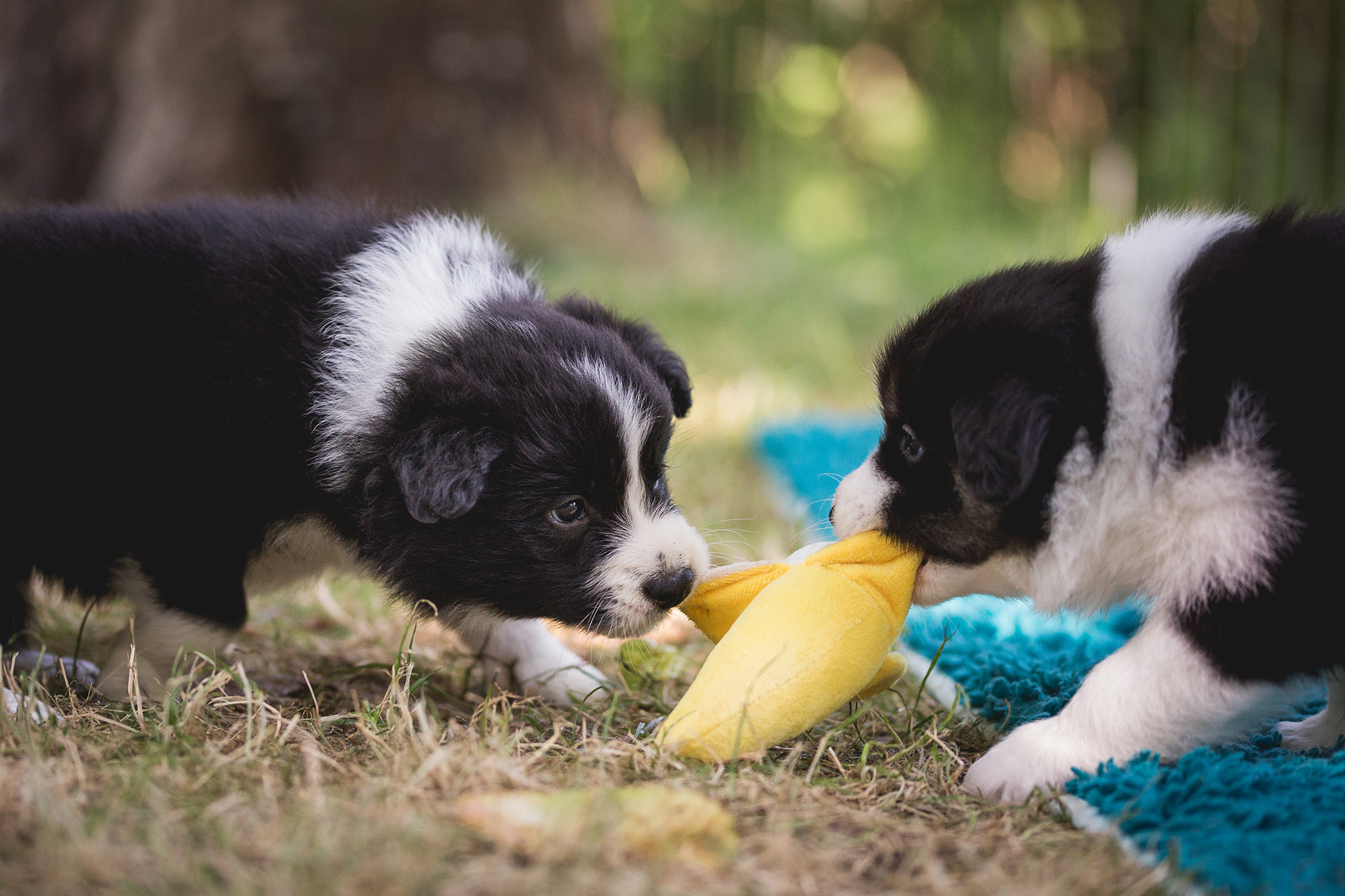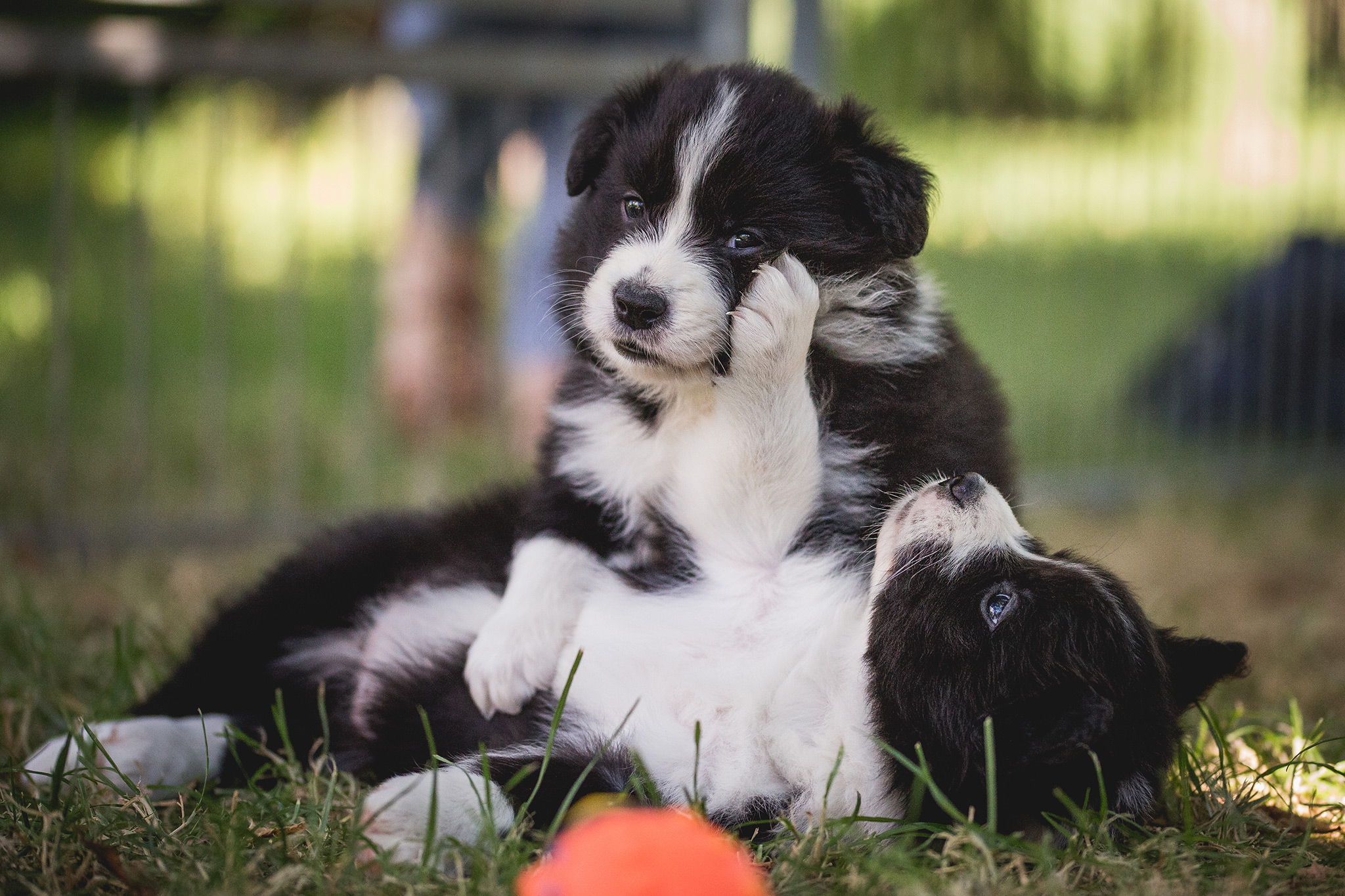 Dass der Boden drinnen regelmäßig gewischt und mit Desinfektionsmittel behandelt wird, ist naheliegend – aber auch draußen behalten wir die Toilettengänge der Welpen immer im Blick und sammeln ihre Hinterlassenschaften umgehend ein. Das nicht bloß, um zu verhindern, dass die Welpen auf den Geschmack kommen, Kot fressen oder sich darin wälzen, sondern auch, weil die Ausscheidungen der Welpen bei den heißen Temperaturen schnell ungebetene Gäste anlocken, sich Fliegen und Wespen im Auslauf tummeln. Auch hier steht also immer eine große Papierrolle bereit – und eine gut gefüllte Gießkanne, um auch das letzte Bisschen guten Geruchs aus dem Gras zu tilgen.