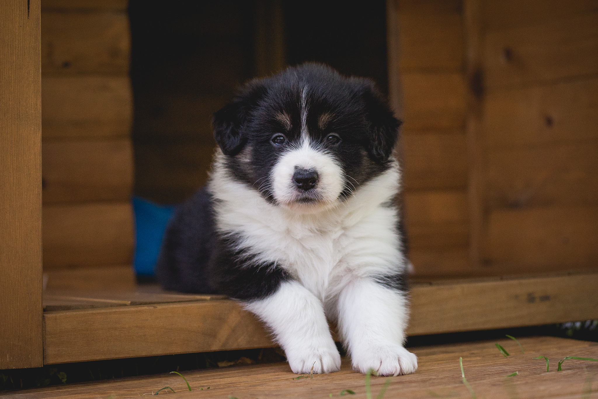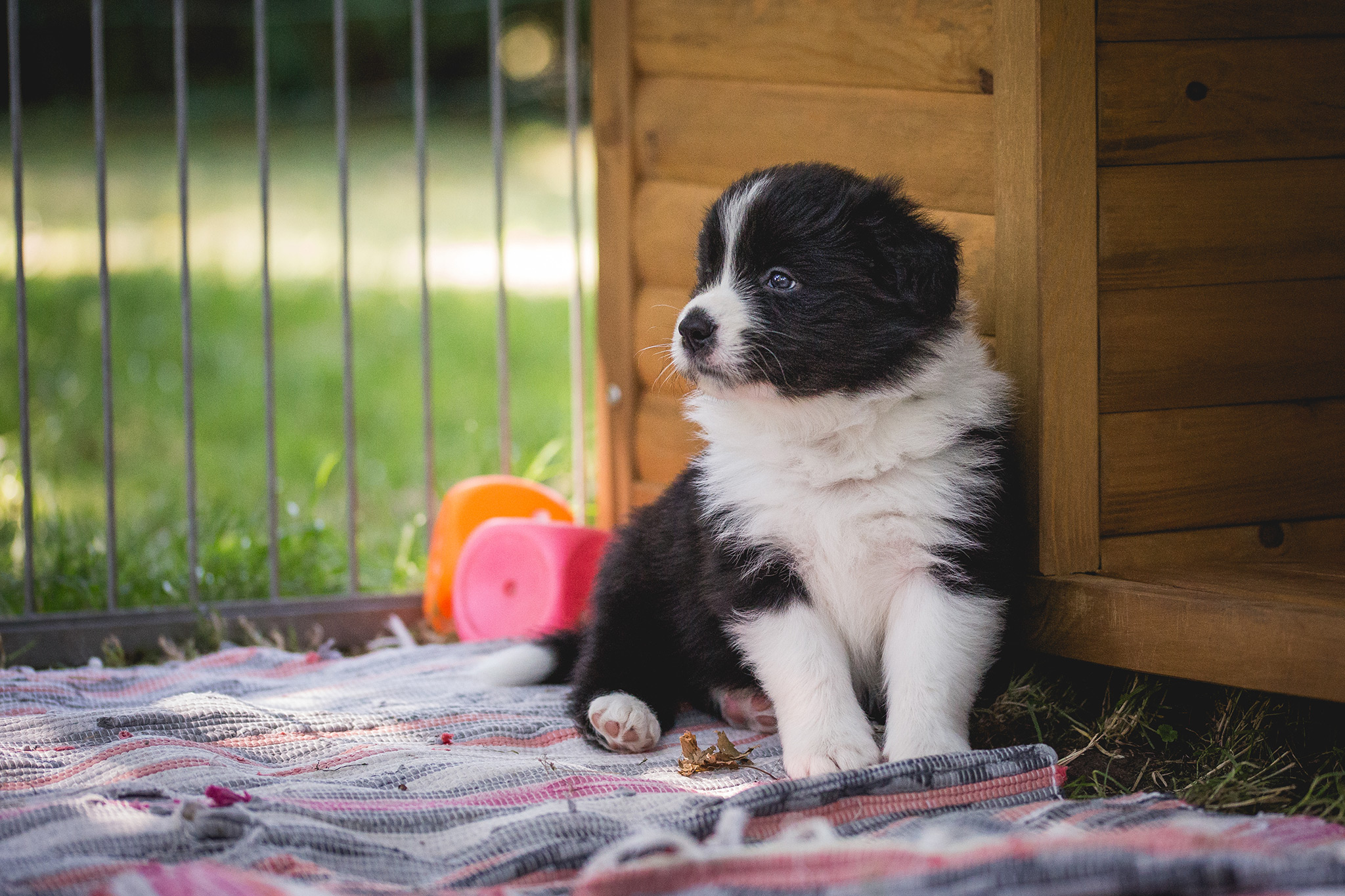 Mit der Erziehung zur Stubenreinheit haben wir allerdings schon viel früher begonnen. Sobald die Welpen sich nicht mehr nur kriechend fortbewegen, bleibt die Wurfkiste offen – meistens ist das in der dritten Lebenswoche der Fall –, und wird den Welpen ein Löseplatz angeboten, der mit Hygienepapier ausgelegt ist. Was hier bereits wichtig ist, setzt sich auch in der weiteren Erziehung zur Stubenreinheit fort: zum Schlaf- und Löseplatz darf es keine Alternativen geben – vor allem keine zusätzlichen weichen Decken, die zum Lösen verwendet werden könnten –, denn die Vorlieben, die ein Welpe nun entwickelt, prägen ihn nicht selten auch weiterhin. Ganz ähnlich sieht deshalb auch die weitere Handhabe aus. Nach dem Umzug ins Welpenzimmer steht den Welpen auch hier nur ein Liegeplatz und ein Löseplatz zur Verfügung – ganz gleich ob tags oder nachts. Der Löseplatz ist nun aber nicht nur bedeutend größer, das eingelegte Papier ist außerdem mit einem schweren Rahmen aus Vierkantholz gesichert, um zu verhindern, dass die Welpen mit dem benutzten Papier spazieren gehen. Bei der Benutzung der Welpentoilette haben sich in der Vergangenheit allerdings oft Unterschiede gezeigt, waren die Hündinnen in der Regel viel schneller davon zu überzeugen, wo sie sich lösen sollten, als die Rüden. Das gleiche Bild setzt sich nun auch bei diesem Wurf fort: während es bei den drei Hündinnen fast genügt hat, sie einmal beim Kreiseln auf das Papier zu setzen, lassen die beiden Rüden drinnen und draußen noch immer dort laufen, wo sie gerade stehen.